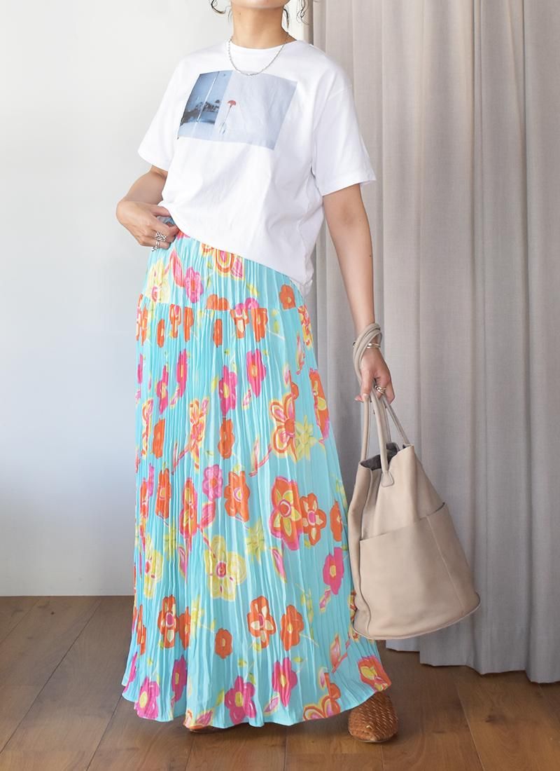 水彩画のような花柄のプリントが綺麗なロングスカート。