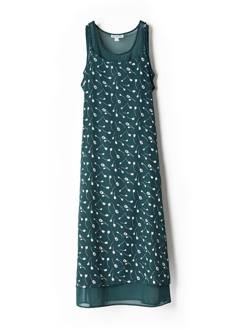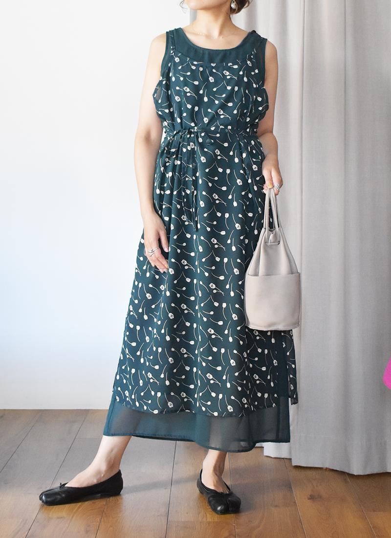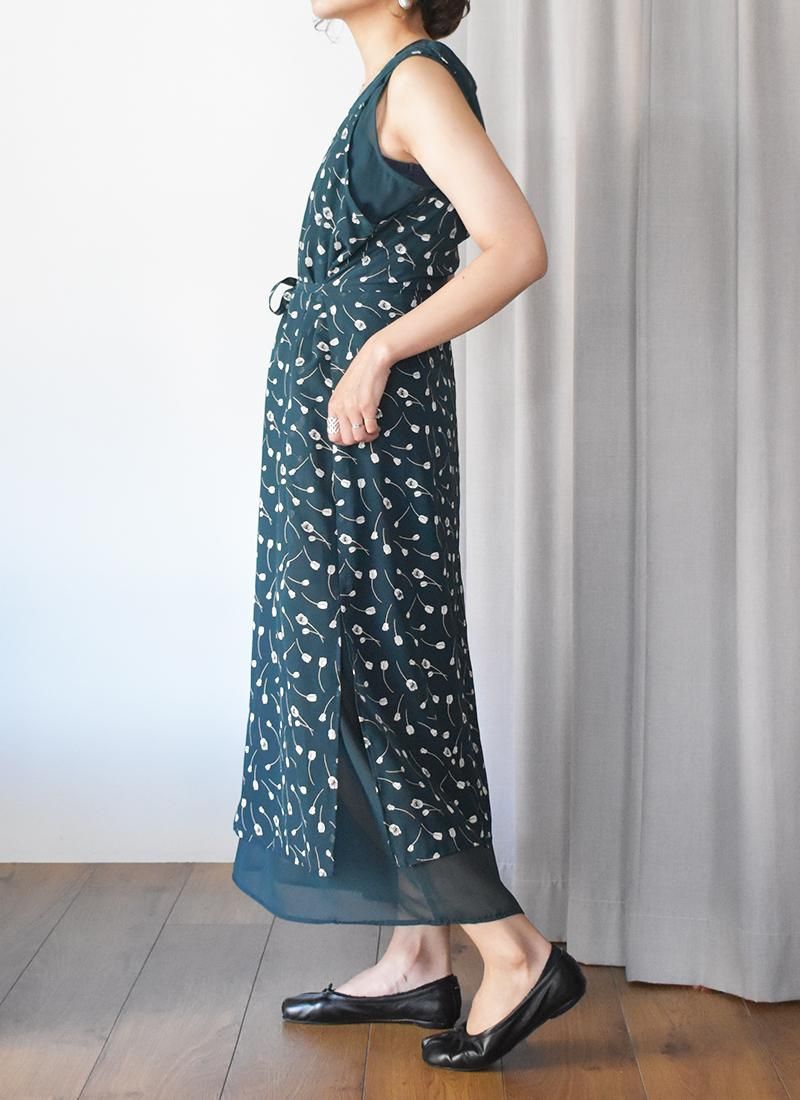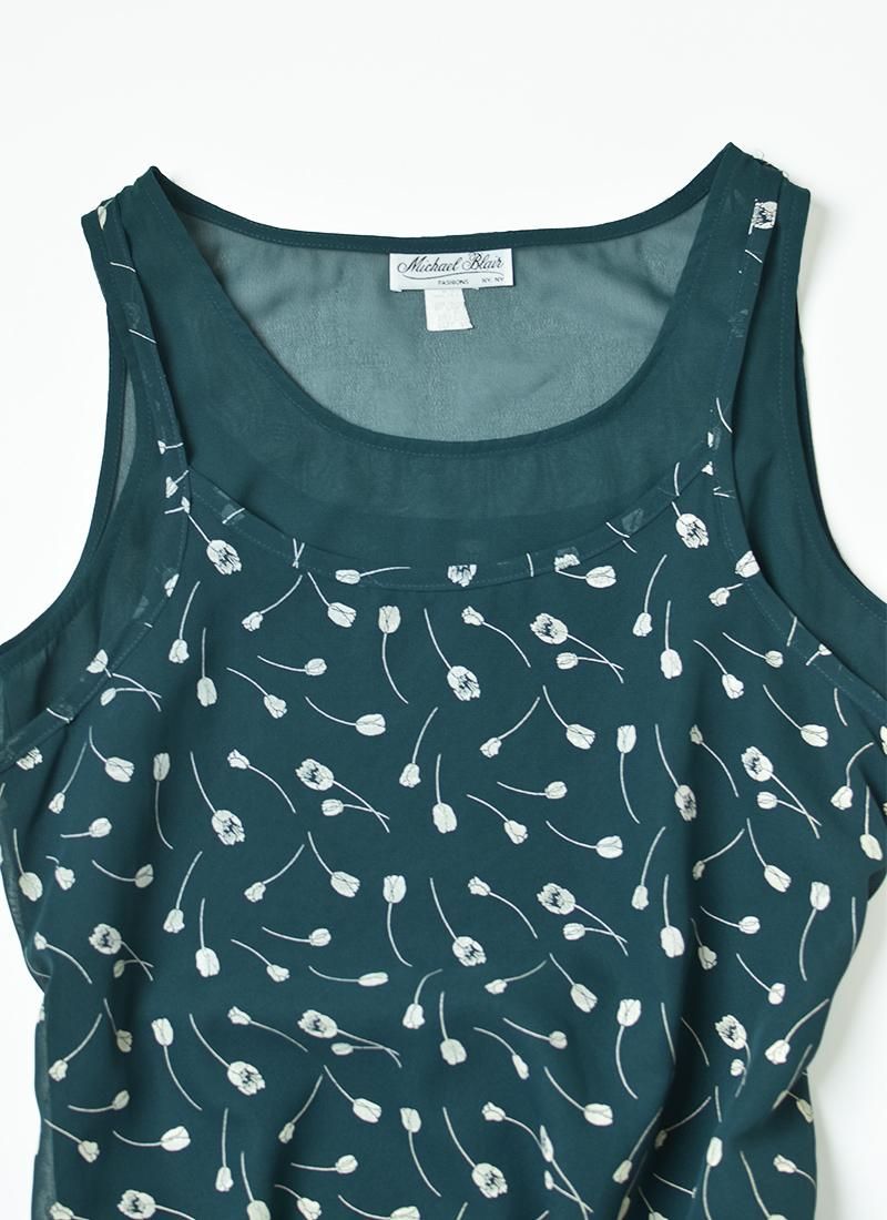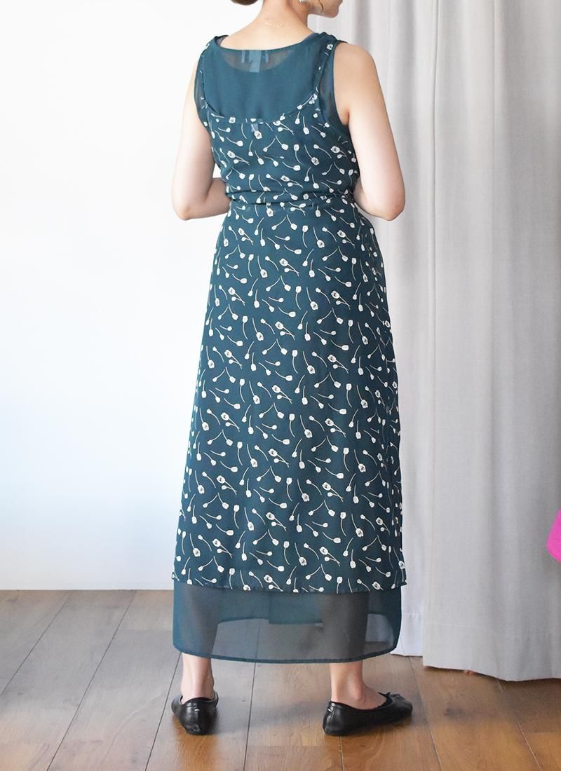 モノトーンな花柄と透け感のある生地でレイヤードされたデザインが素敵な80年代頃のロングドレスになります。