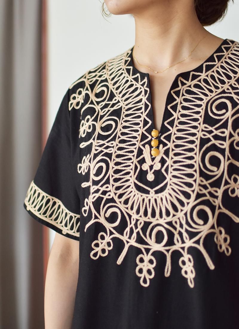 日常にも合う落ち着いたブラックの色合いで、一枚で雰囲気の出るドレスです。