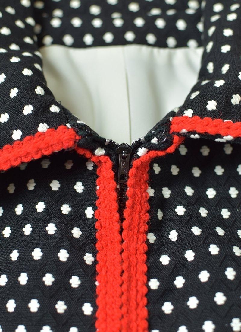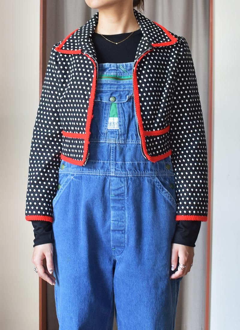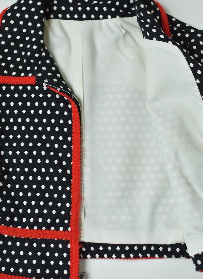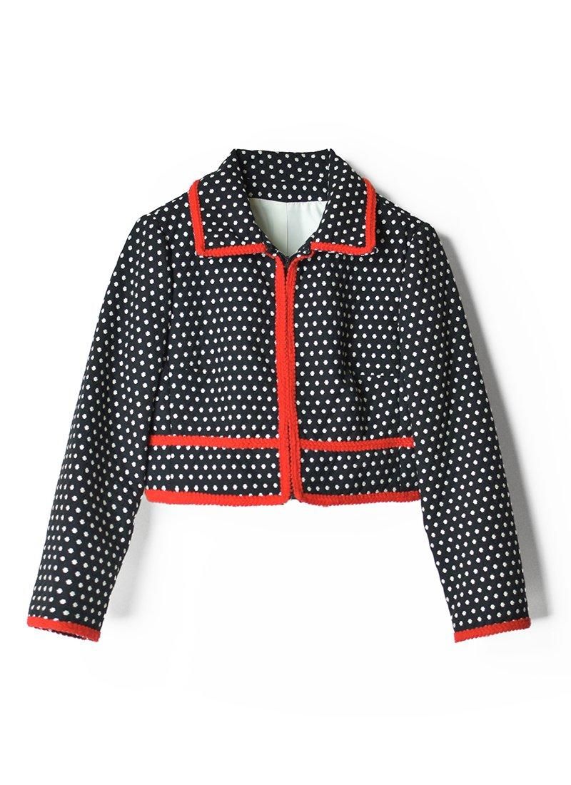 シックなドット柄に赤のパイピングがアクセントになったショートジャケット。