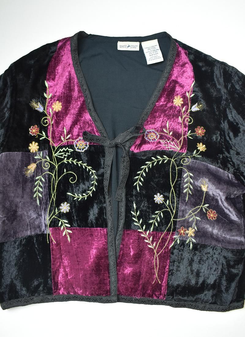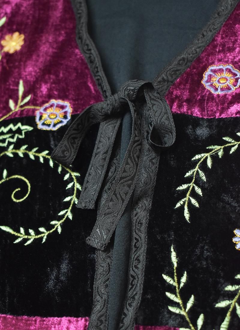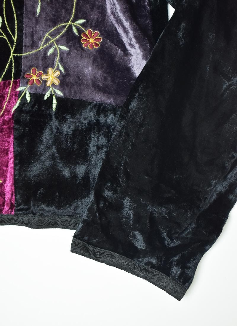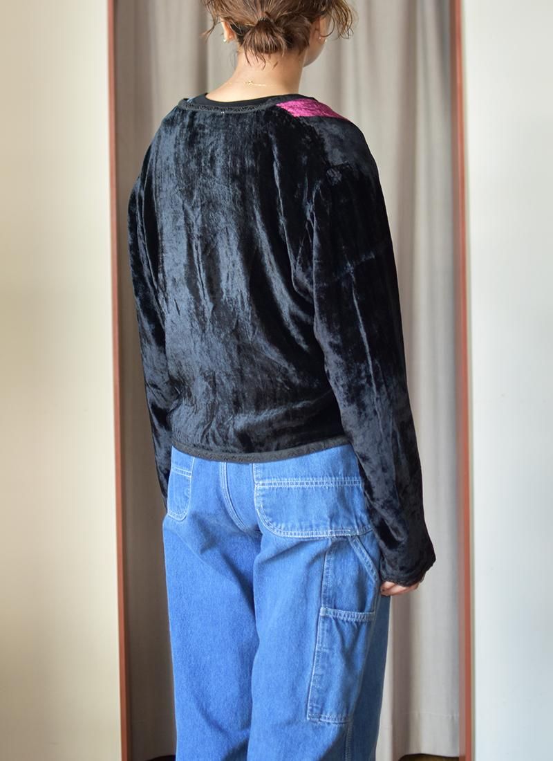 上品なベロア素材にフロントのフラワー刺繍が素敵なカーディガンになります。