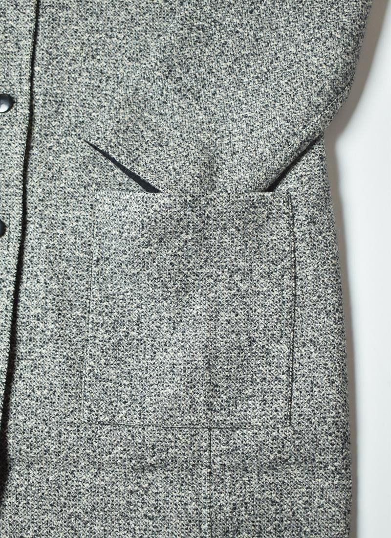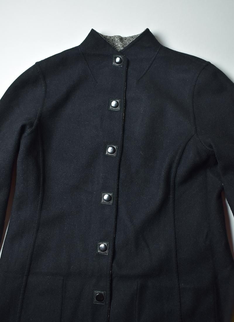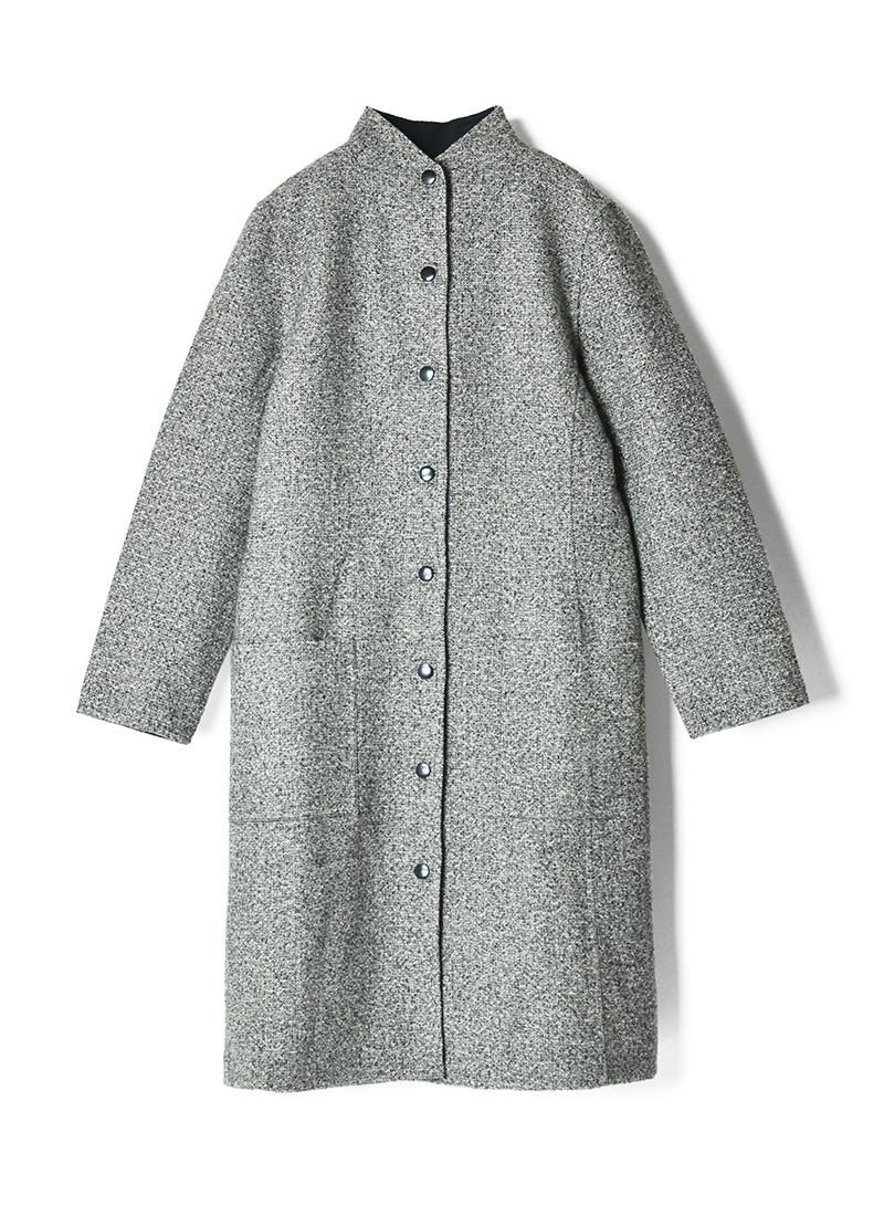ツイードどブラックのコンビネーションになったスタンドカラーコート。