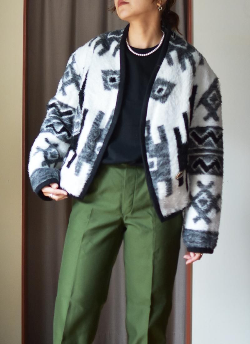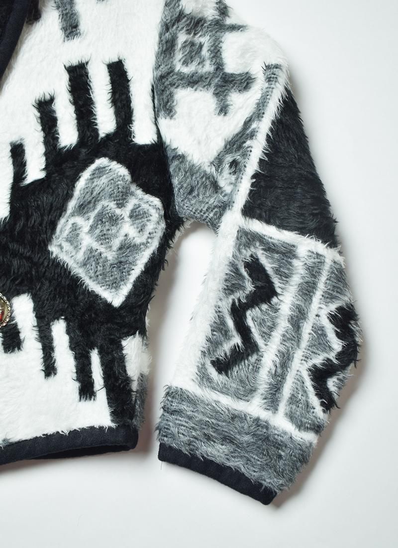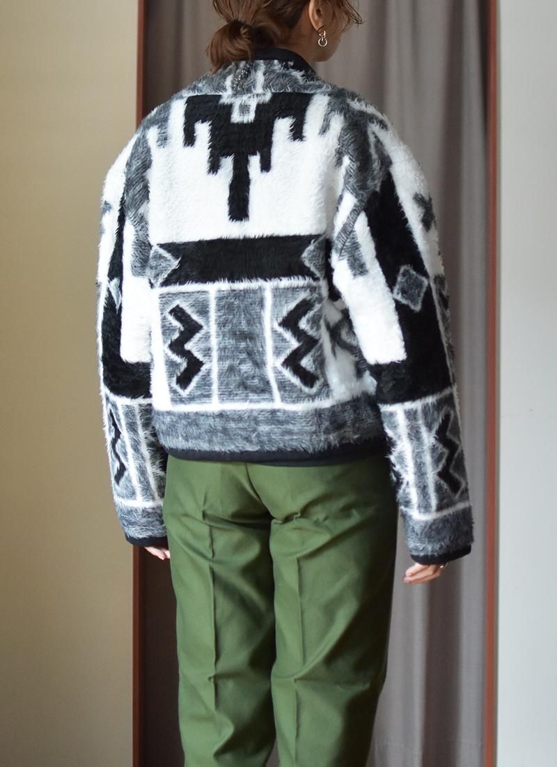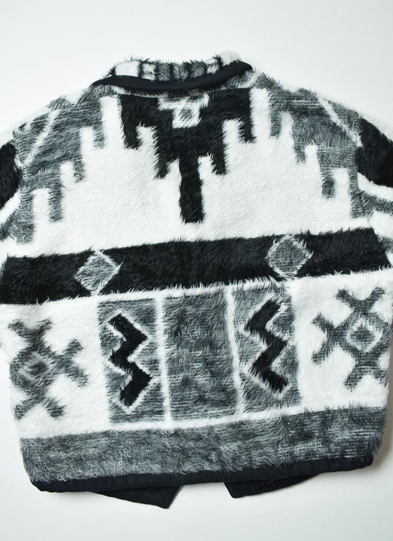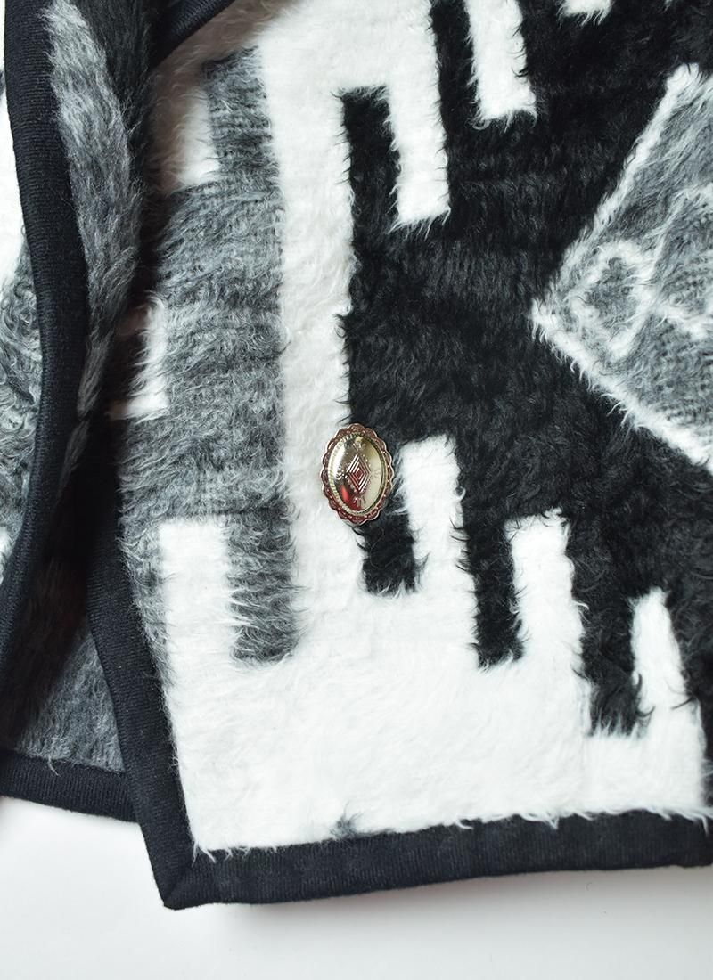 モノトーンなネイティブパターンが目を引くショールカラージャケット。