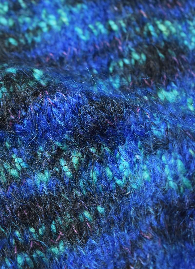 色鮮やかなパープルとブラックの配色がカジュアルにも少しエッジのある着こなしにも合うデザイン。コーディネイトの主役となるニットです。