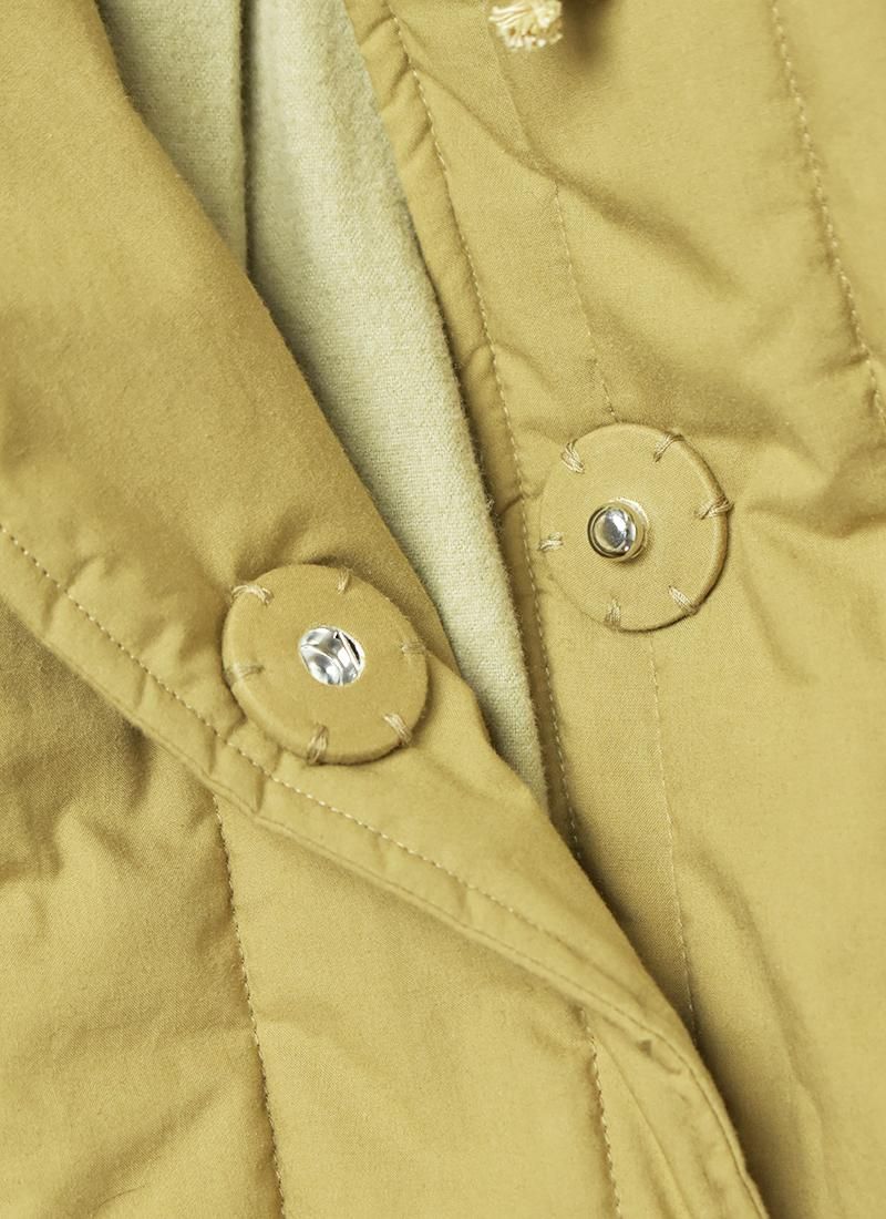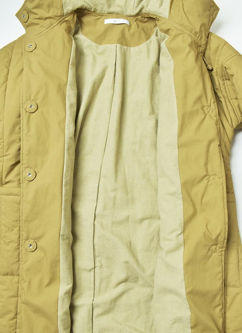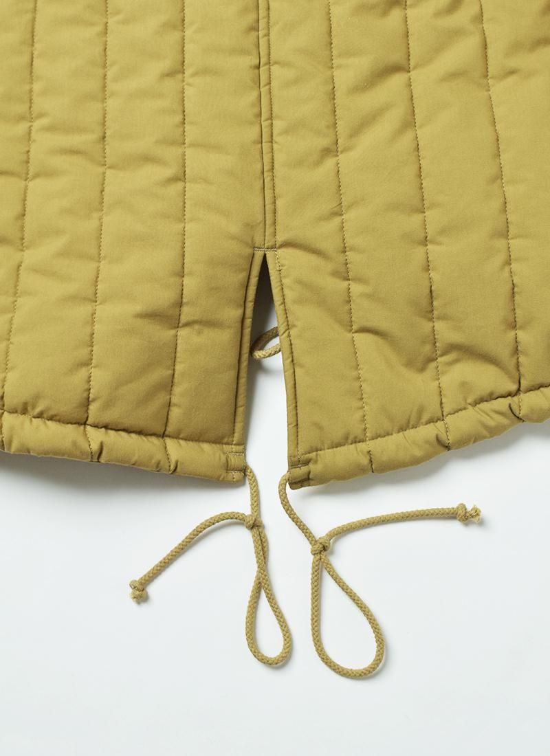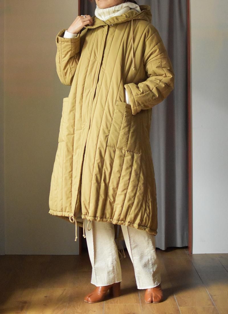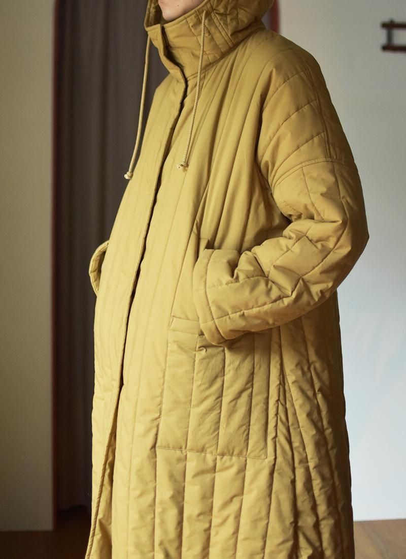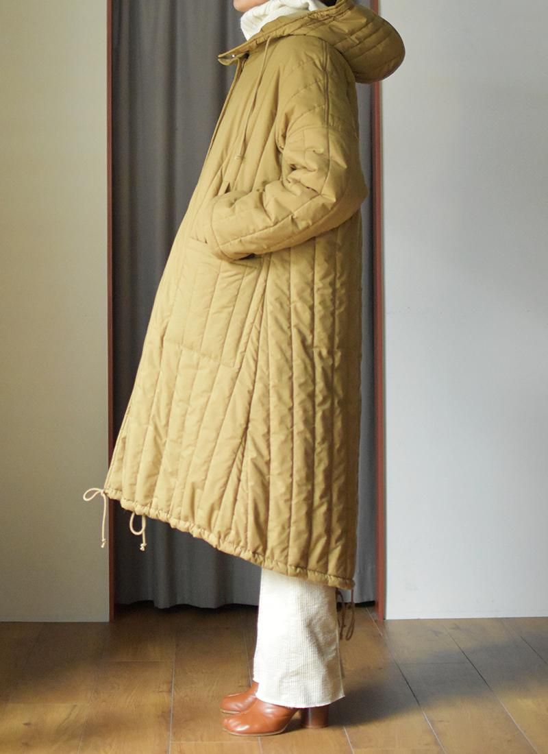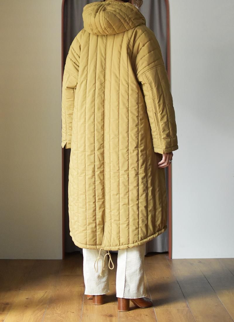 厚手のオーガニックコットンを2インチのストライプステッチでたたいたオリジナルキルトを贅沢に使用したマキシ丈のモッズコートです。