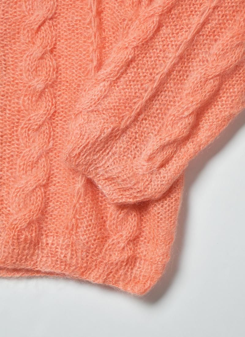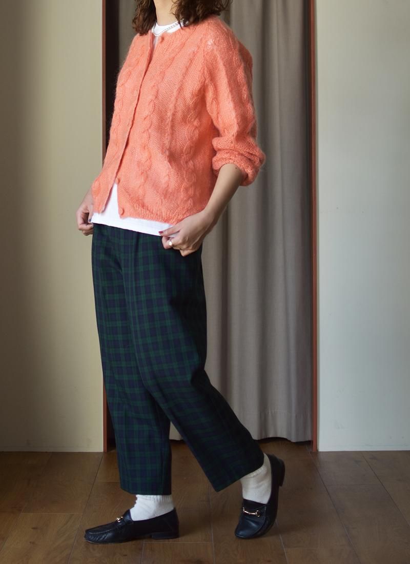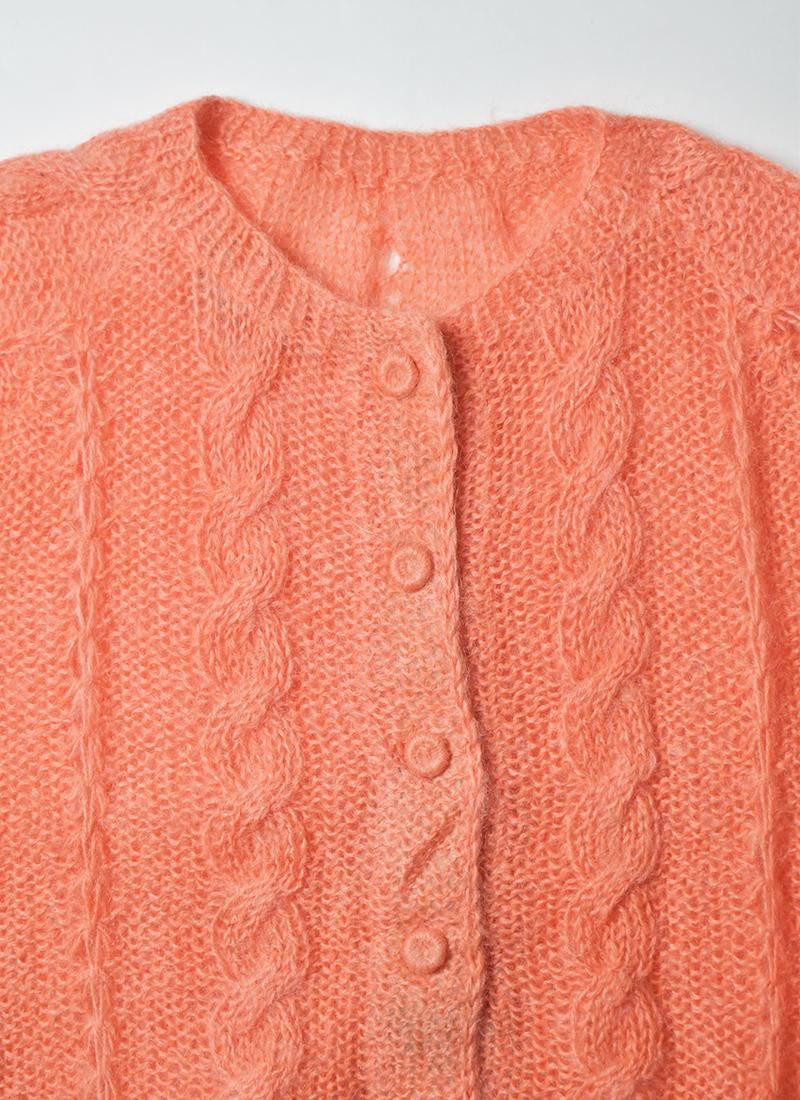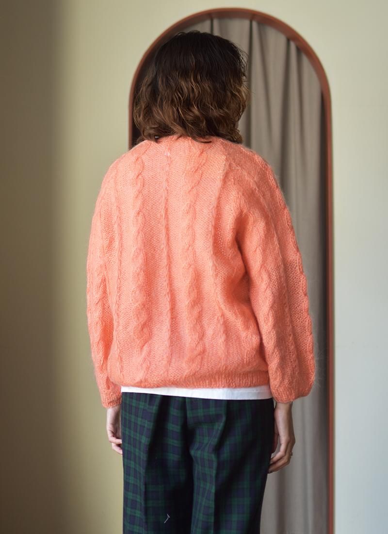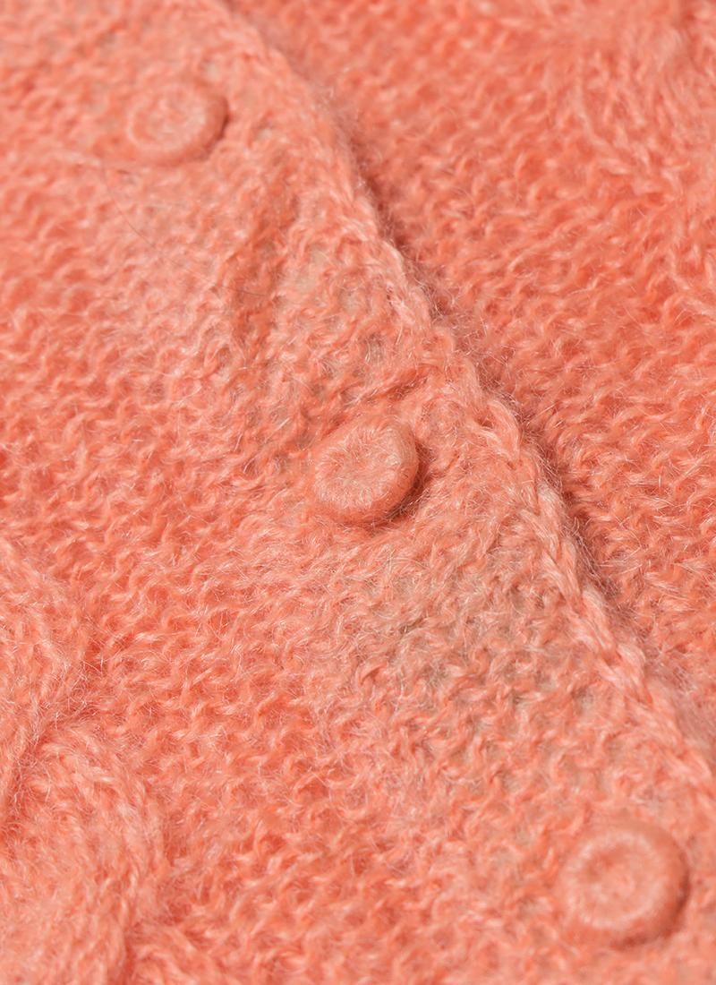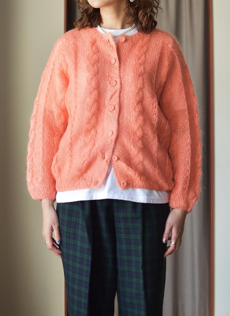 鮮やかなサーモンピンクが目を引くモヘアカーディガン。