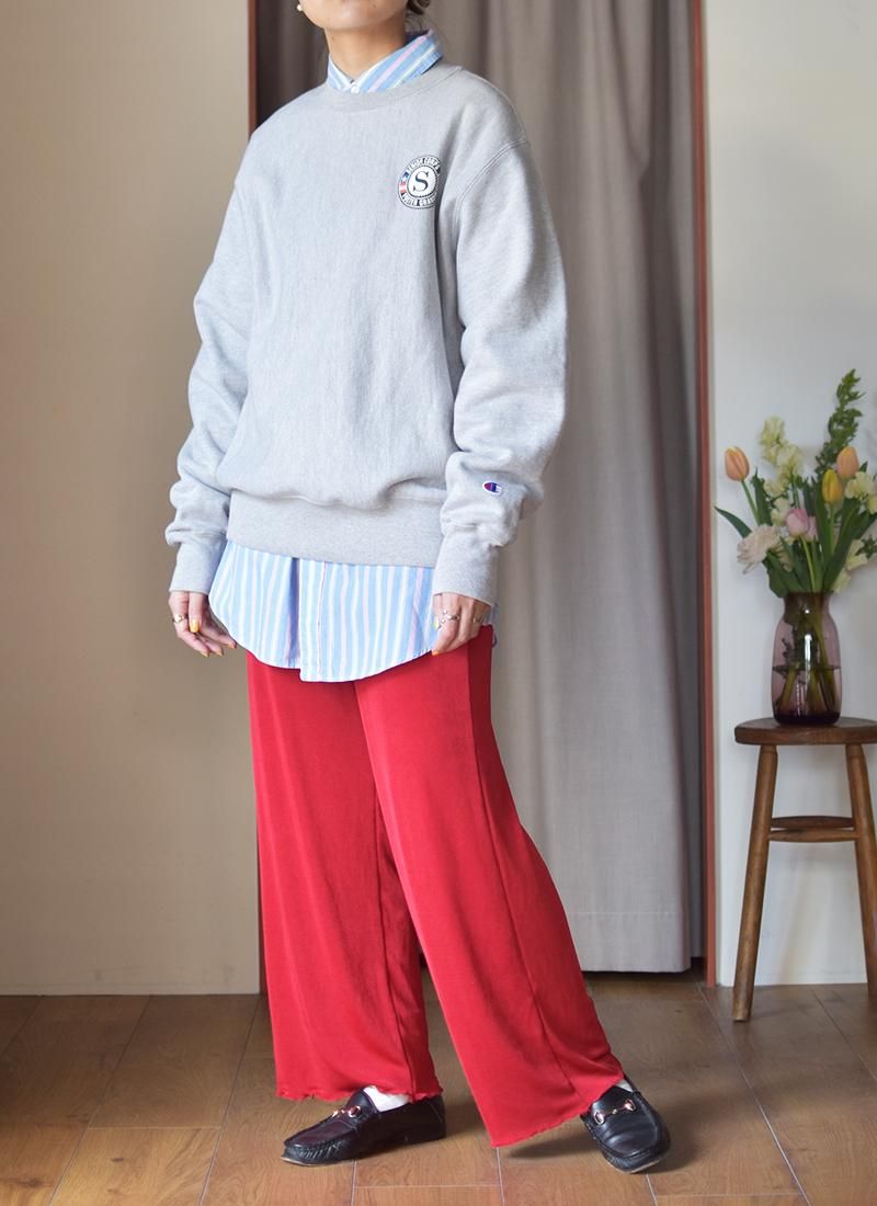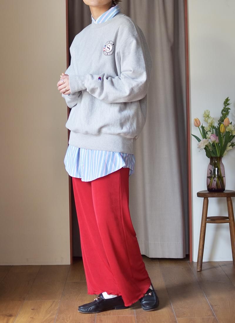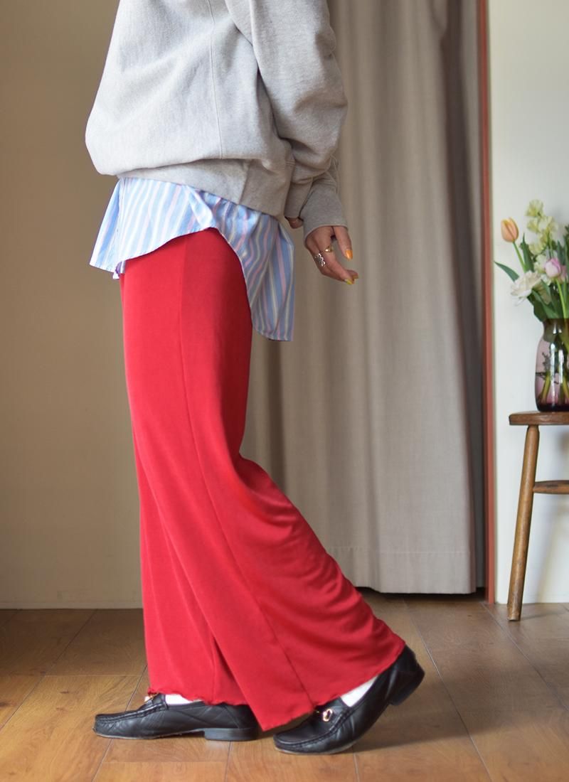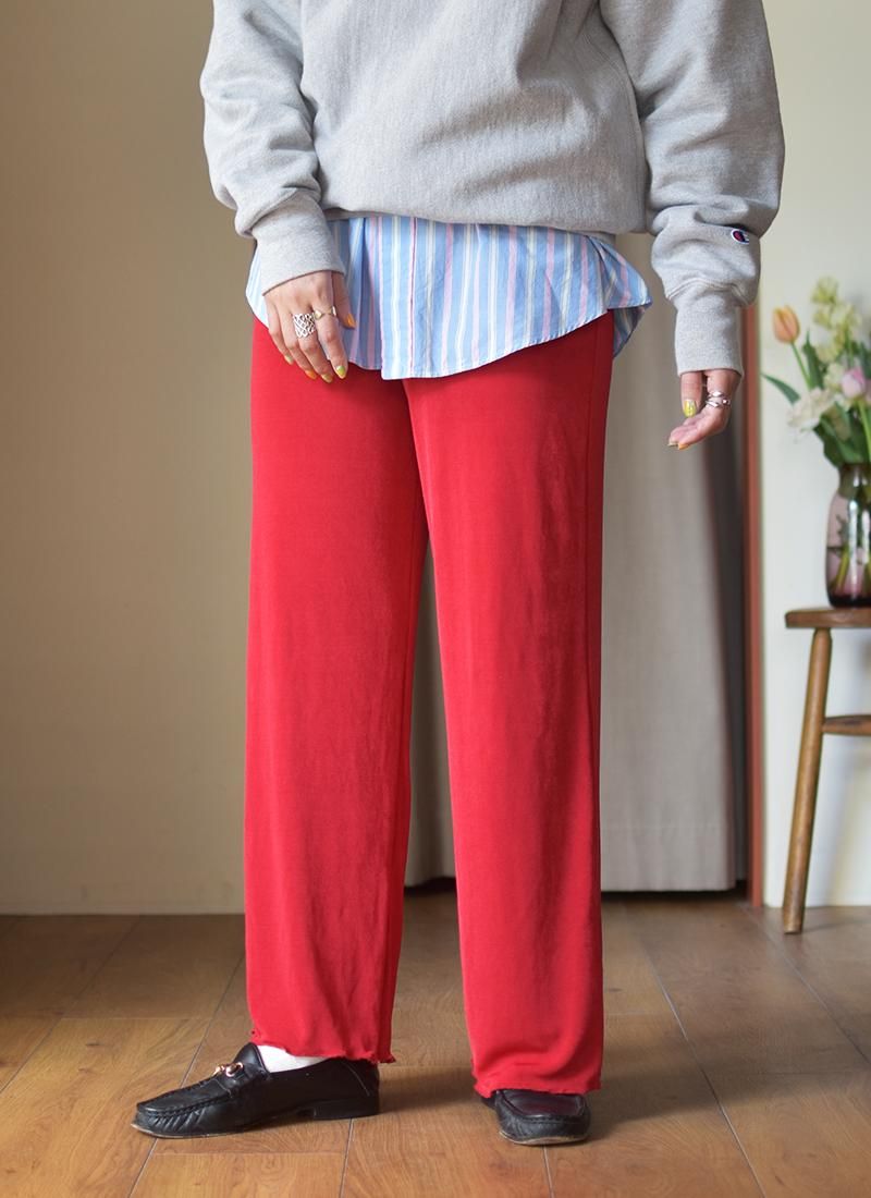光沢感のあるレッドカラーのUSA製カラーイージーパンツ。