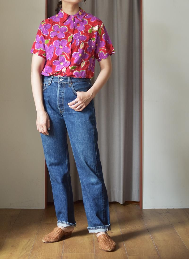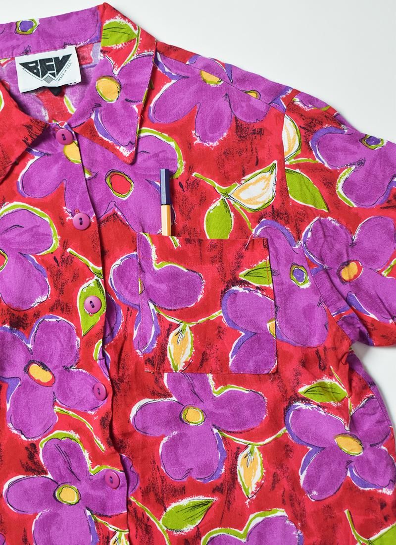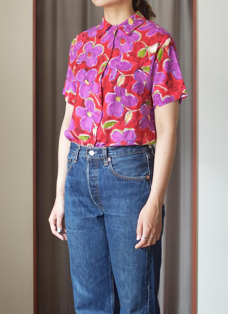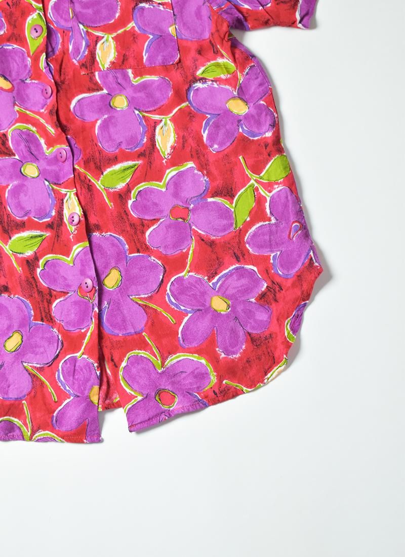 鮮やかな配色が目を引く可愛さのレーヨンフローラルシャツ。
