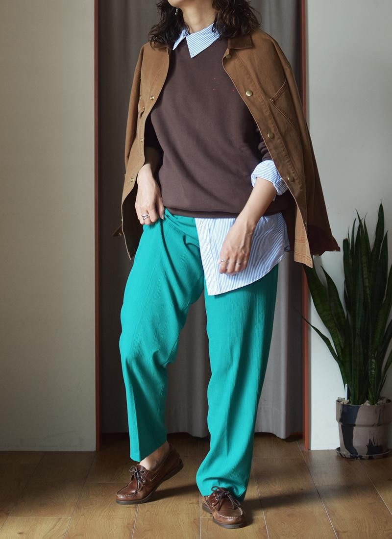 コーディネイトに映える綺麗な色合いの80sポリエステルイージーパンツ。