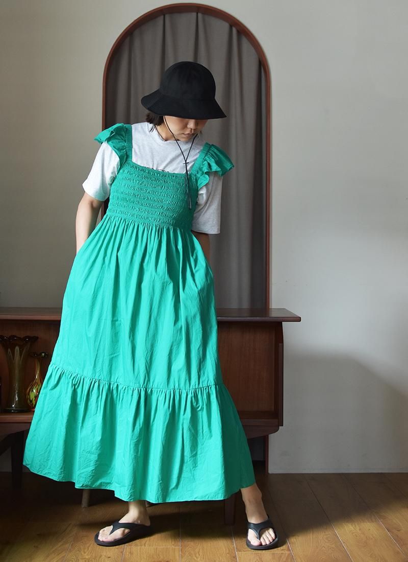 肩紐がフリル仕様になっており可愛らしい印象ですが、Tシャツをレイヤードして可愛くなり過ぎないスタイル仕上げも◎