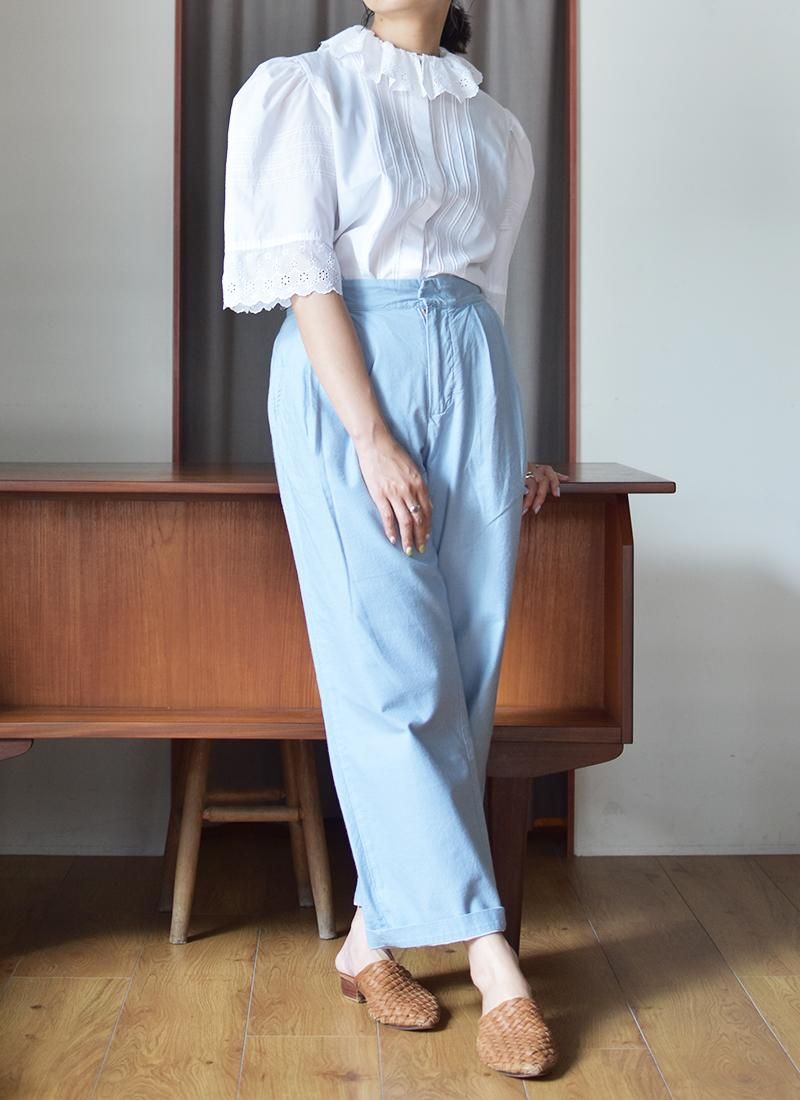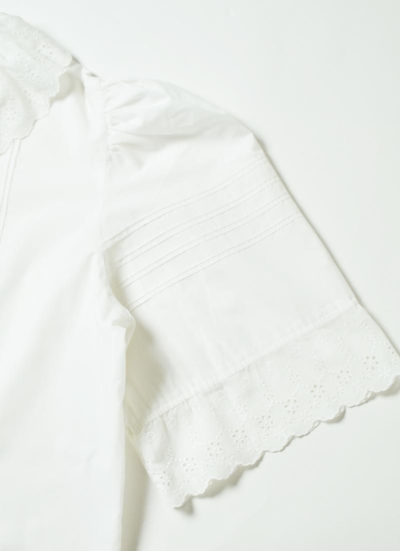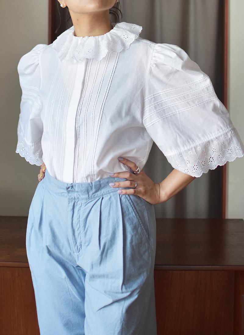 首元のフリルと袖のデザインが可愛らしいユーロブラウス。