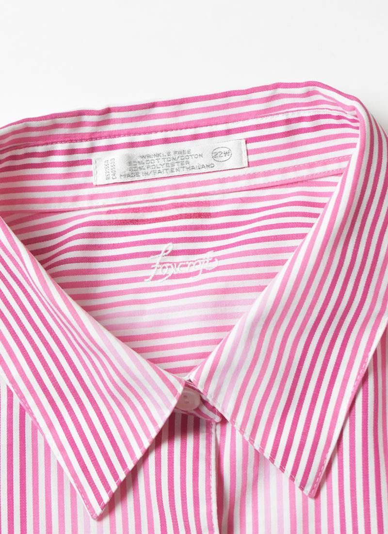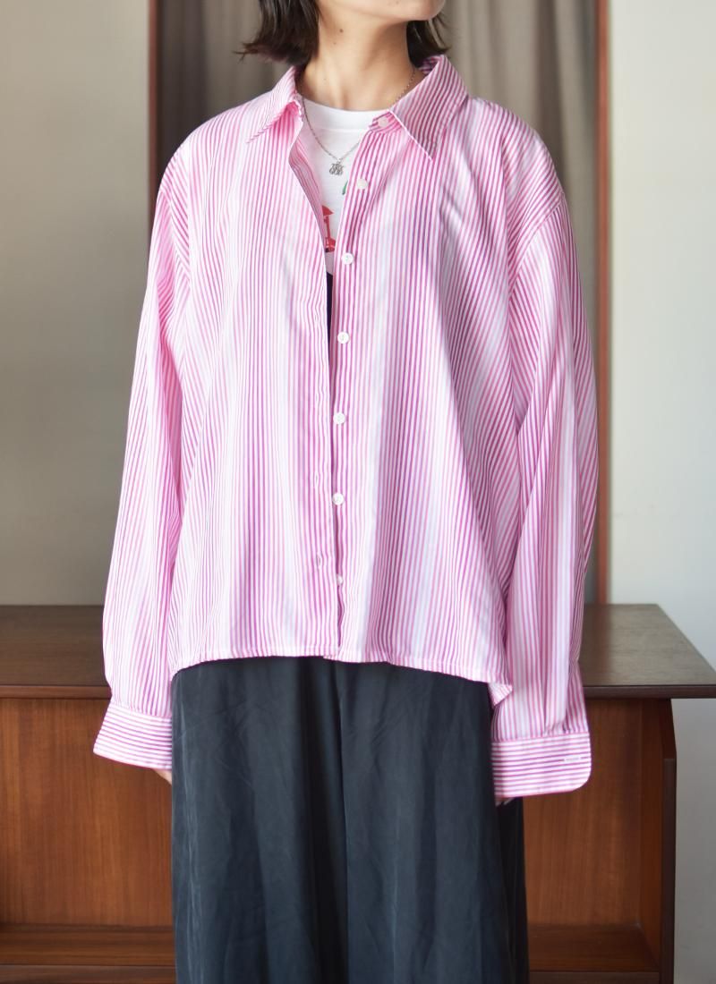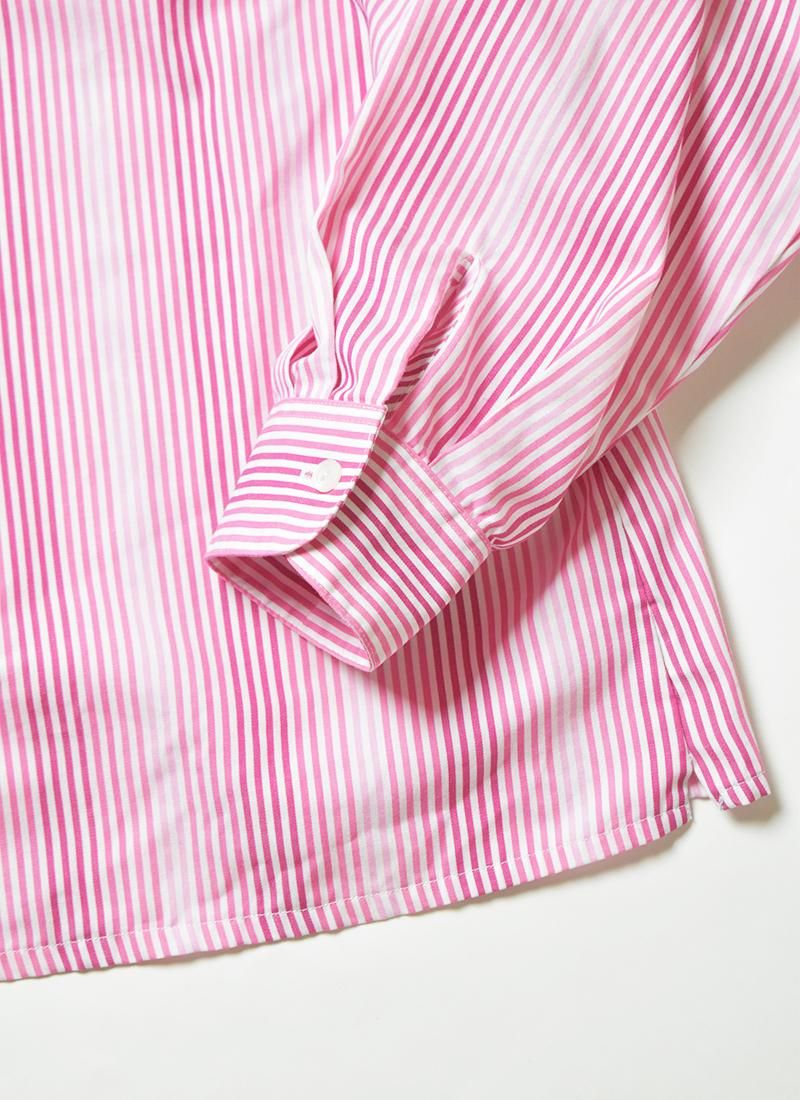ピンクベースのマルチカラーが魅力的なストライプシャツ。