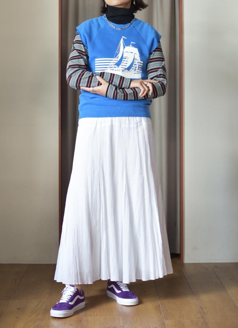 これからの時期のスウェットやニット等ボリュームが出がちなスタイリングに抜け感が出て軽やかな印象に。