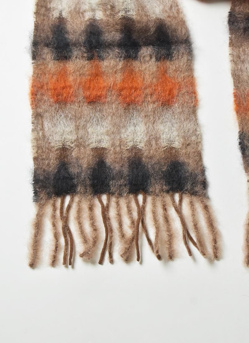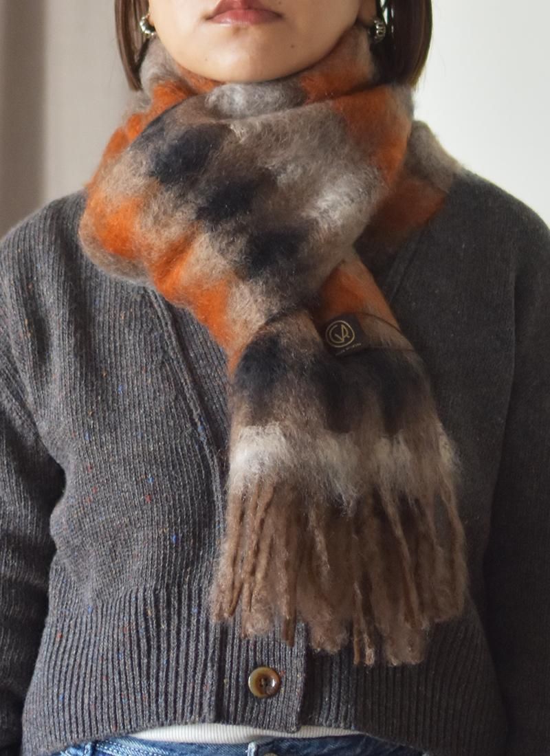 毛足の長いモヘアをふんわりやわらかく編み上げたマフラーで、軽くて暖かな着用感。