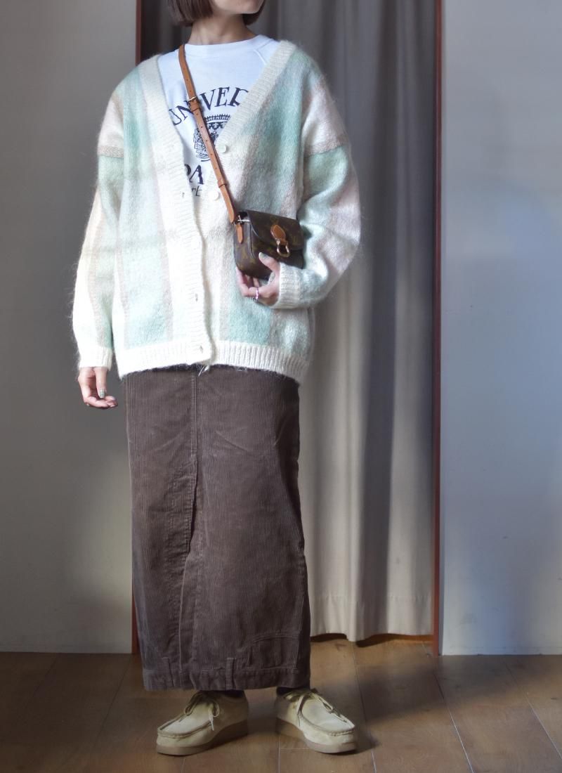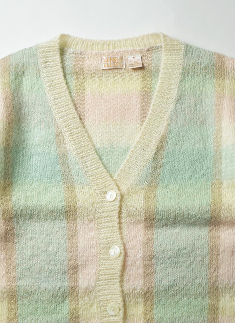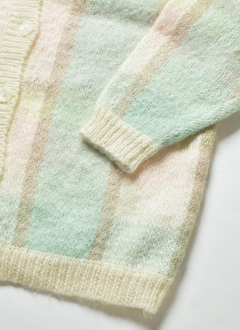 うっすらとチェック柄が入ったアンニュイな色合いが可愛いモヘアカーディガン。