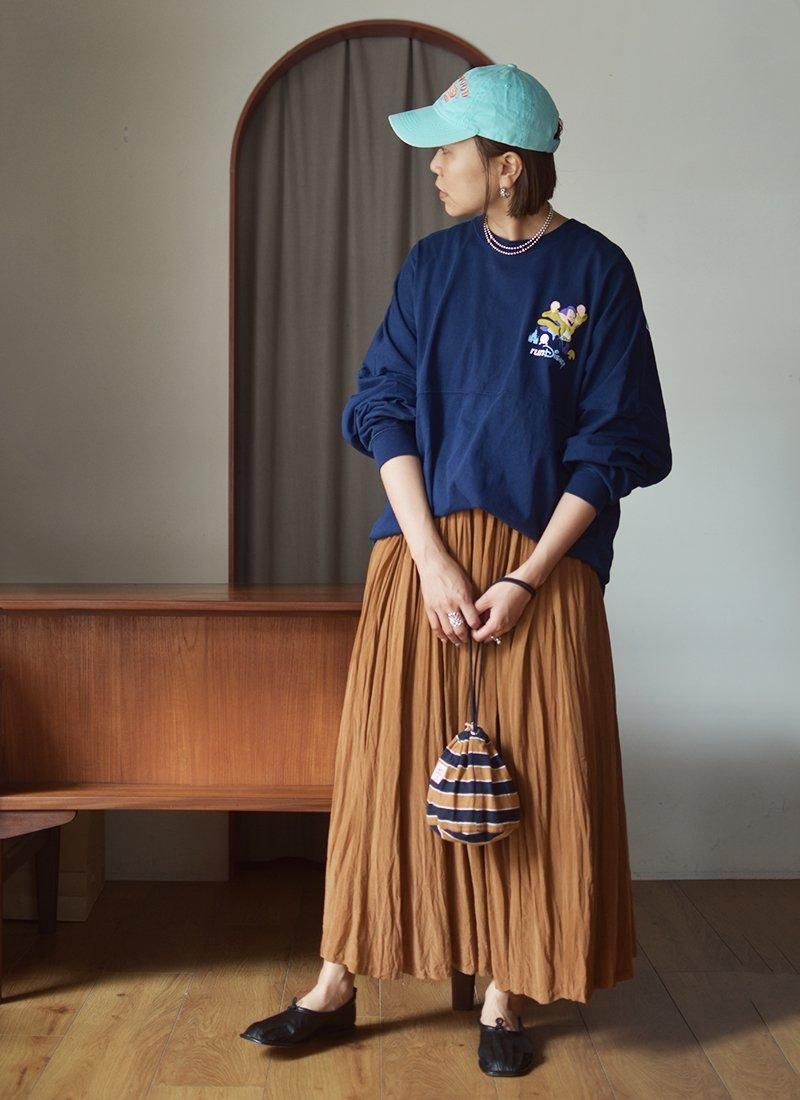 フェミニンなスカートなのでトップスはあえてメンズライクなアイテムで合わせてみては。