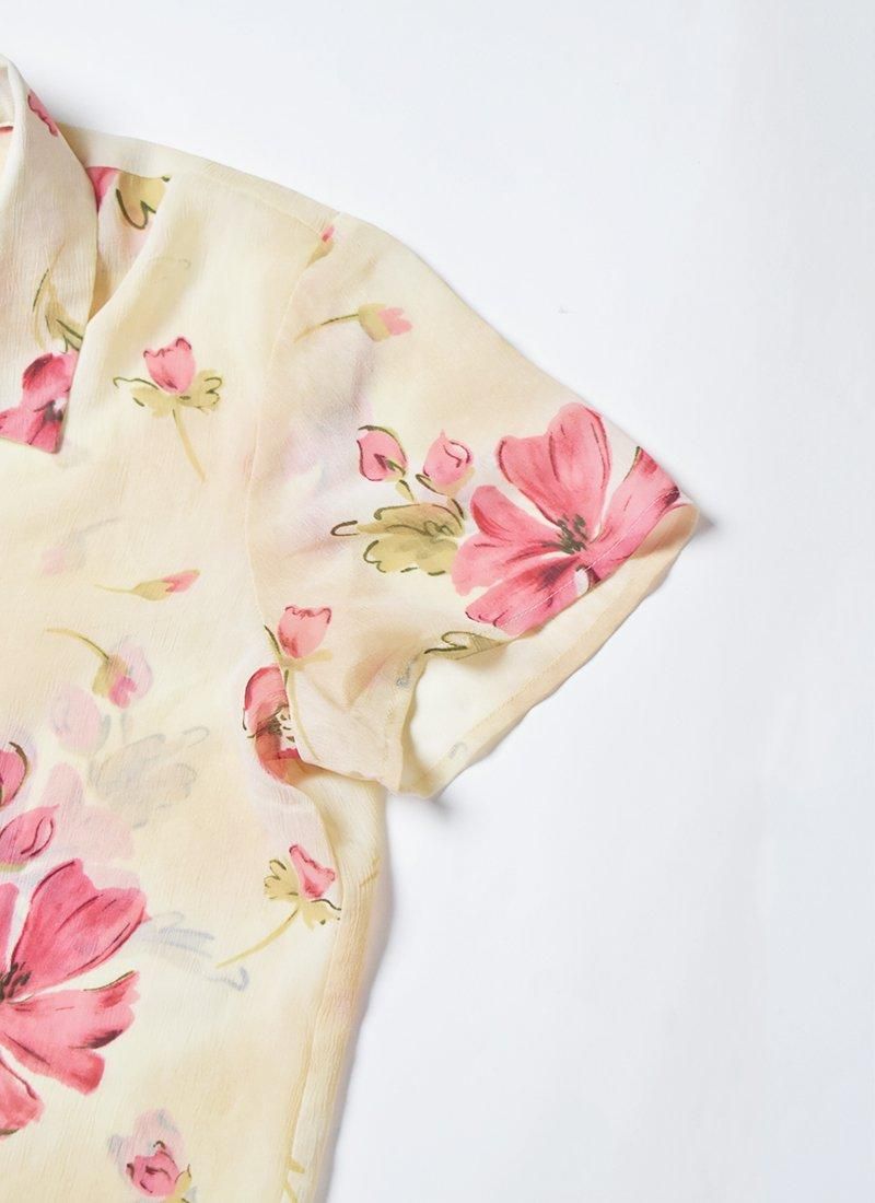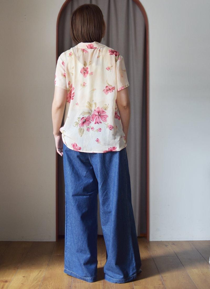 透け感のある花柄のデザインが素敵なオープンカラーシャツ。