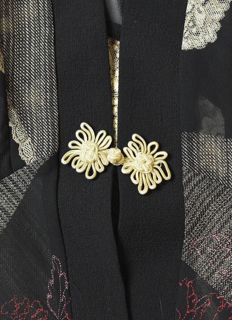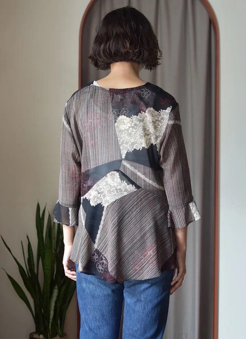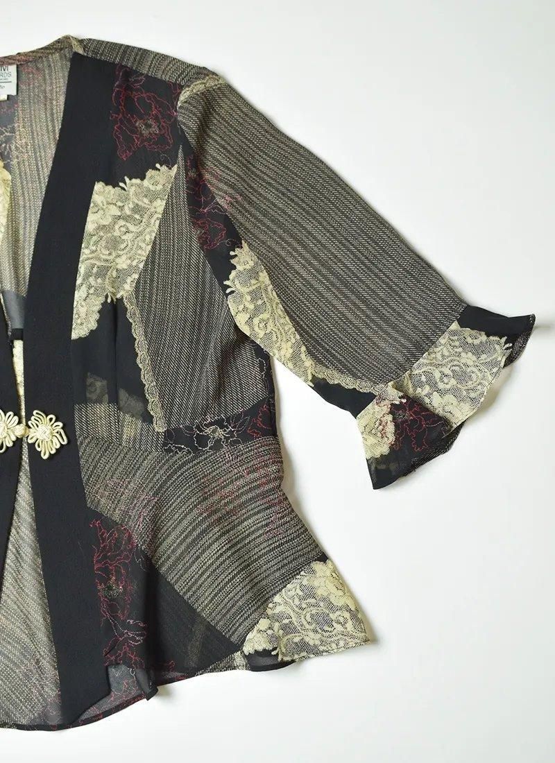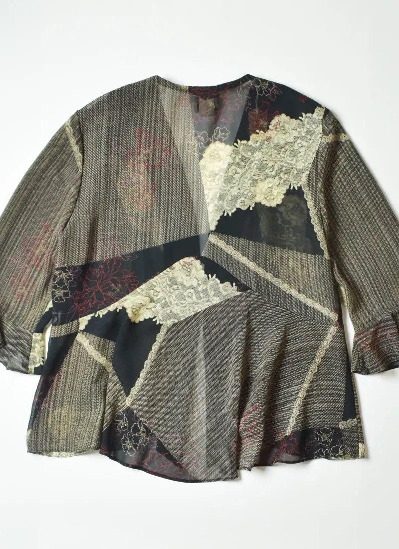 和の様なパッチワーク柄や袖のフリルが特徴的な90年頃のデザインブラウスになります。