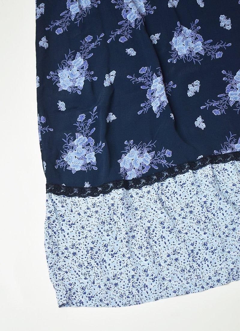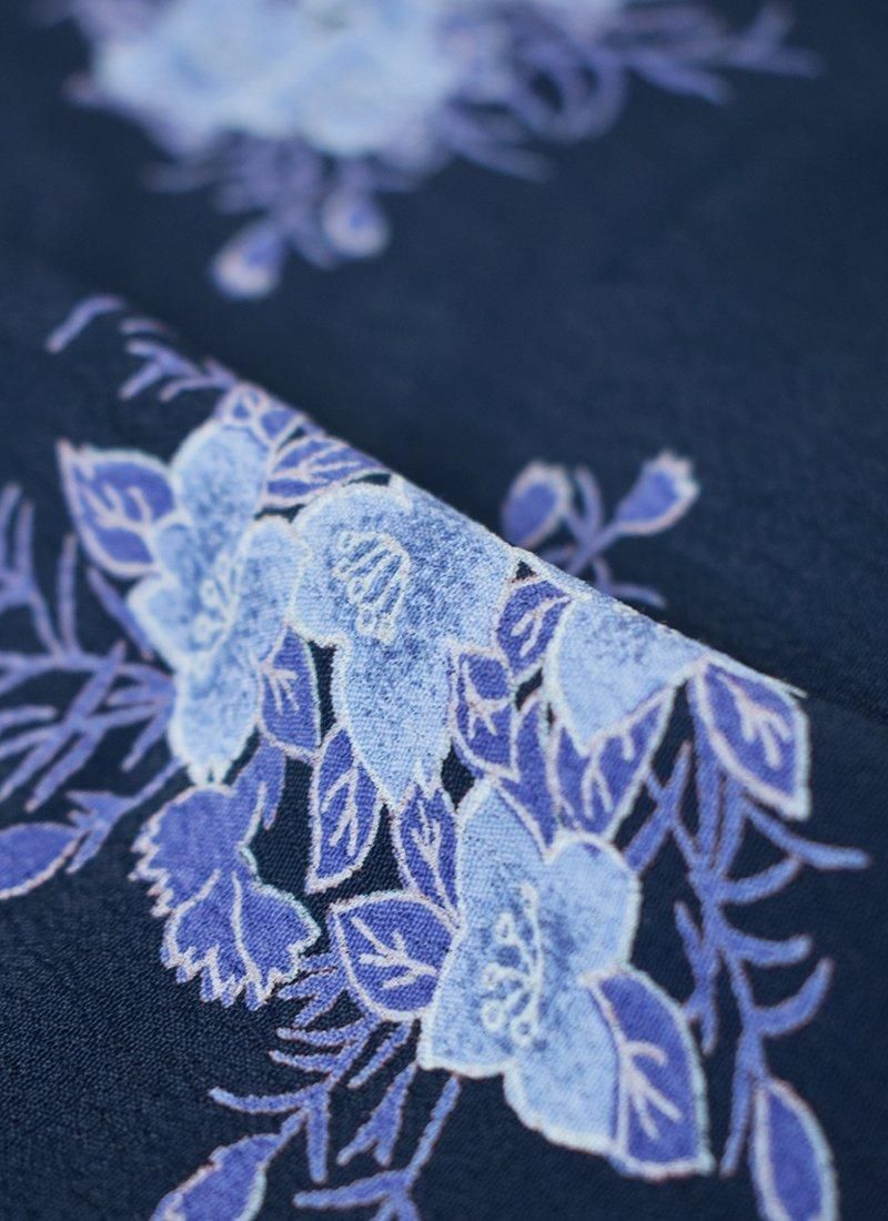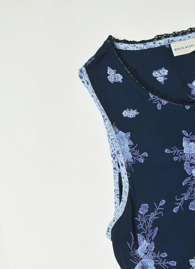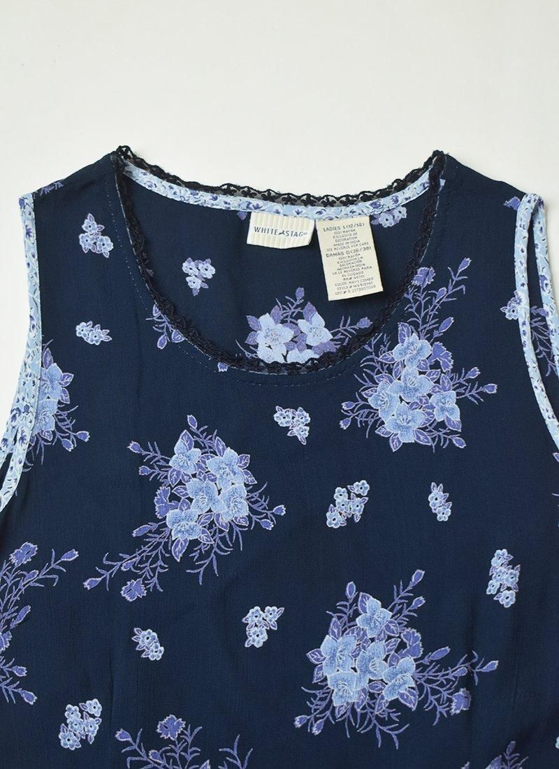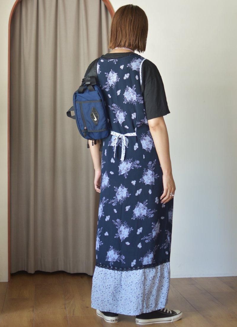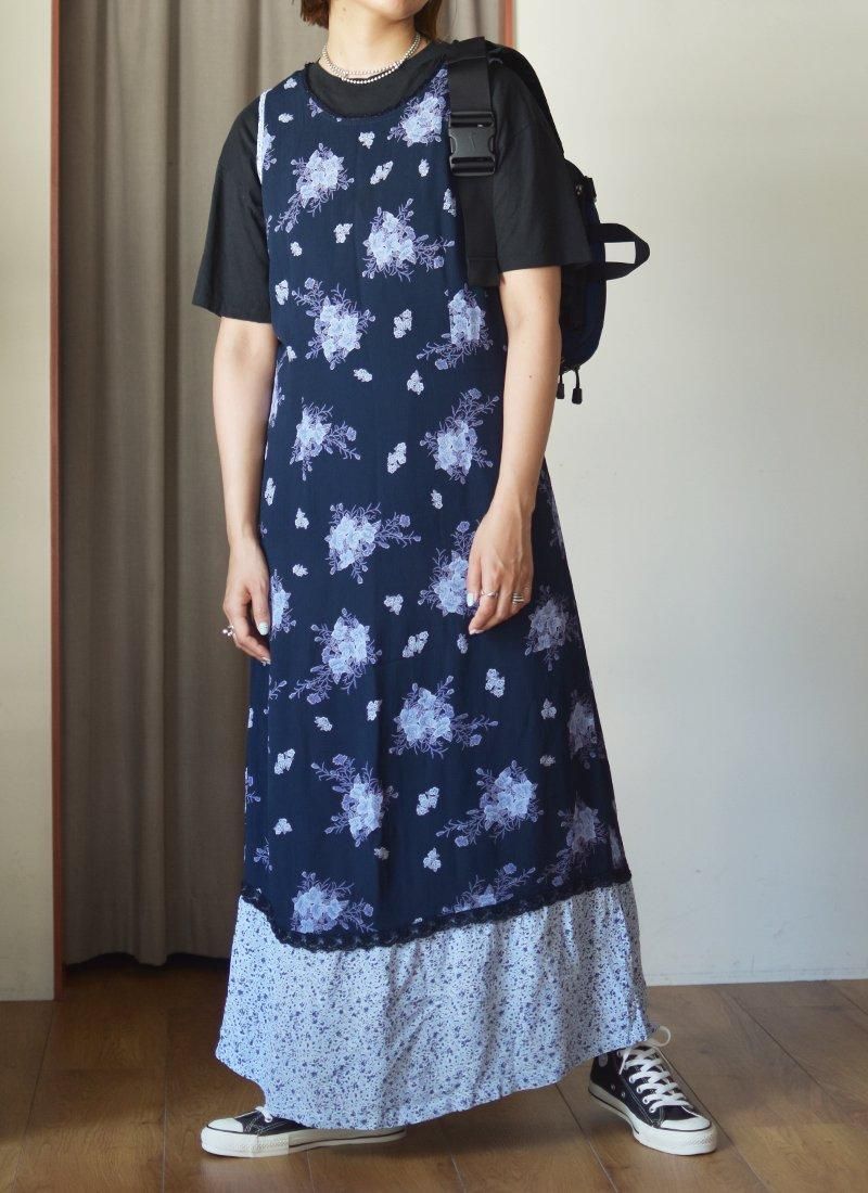 ネイビーベースの花柄にティアードデザインが可愛い90年代頃のノースリーブドレス。