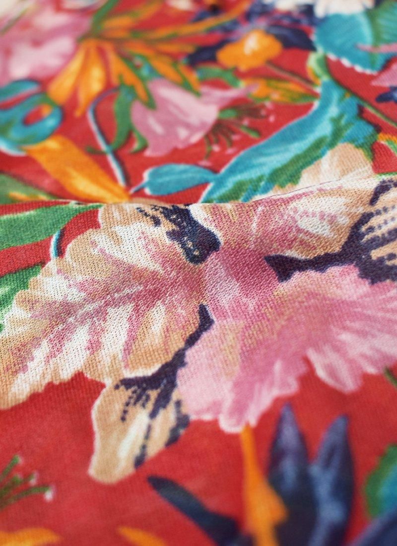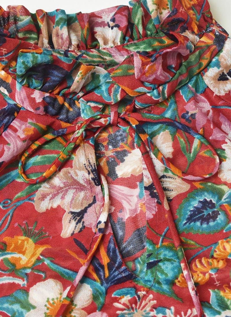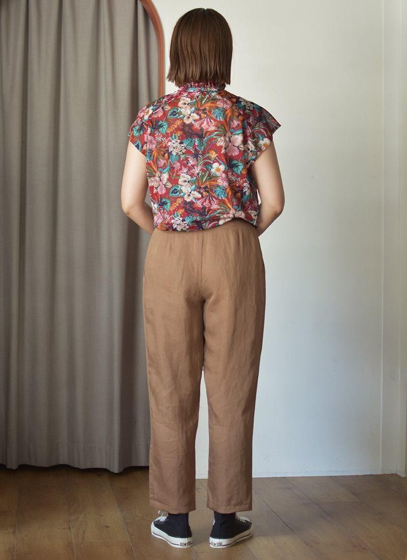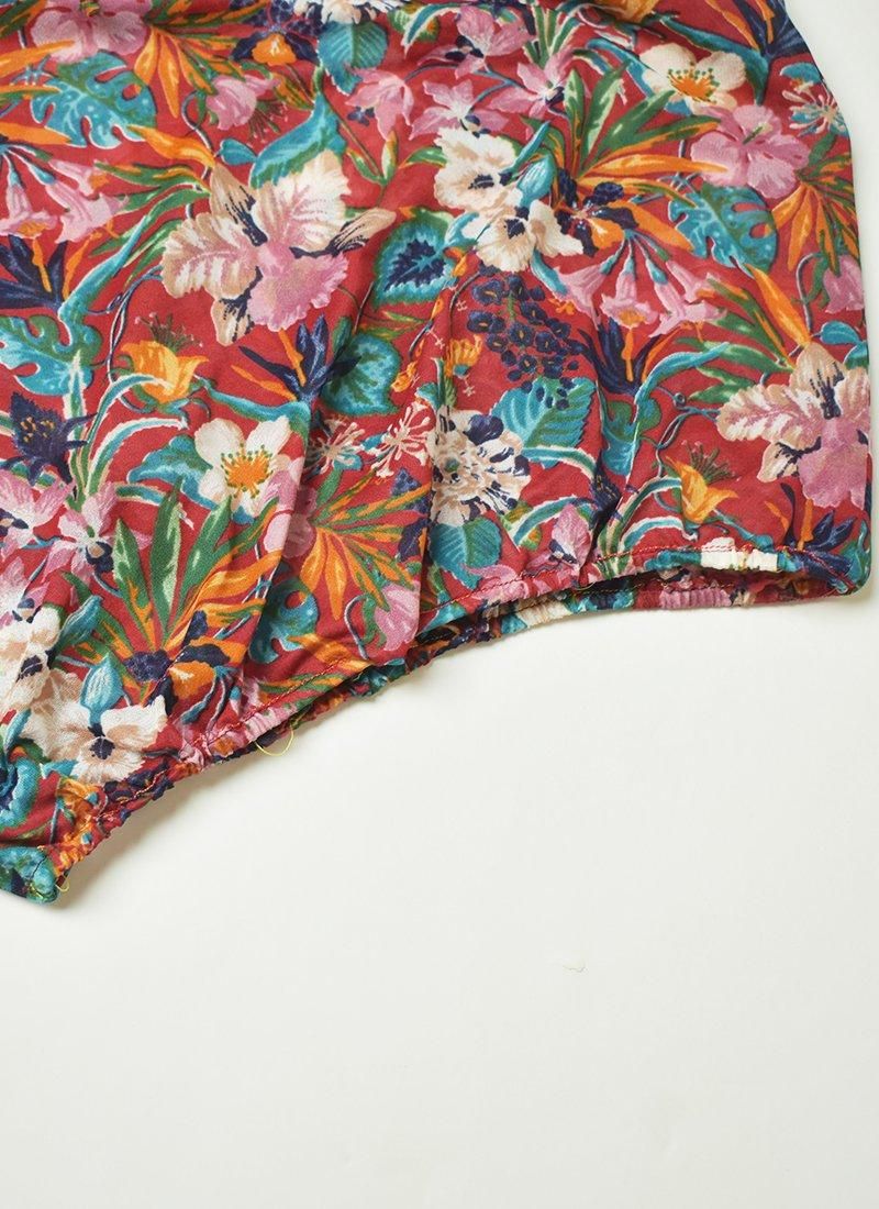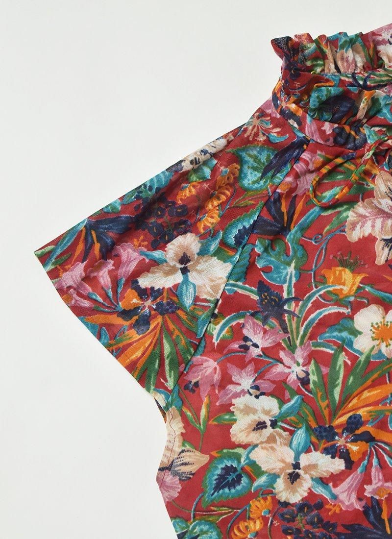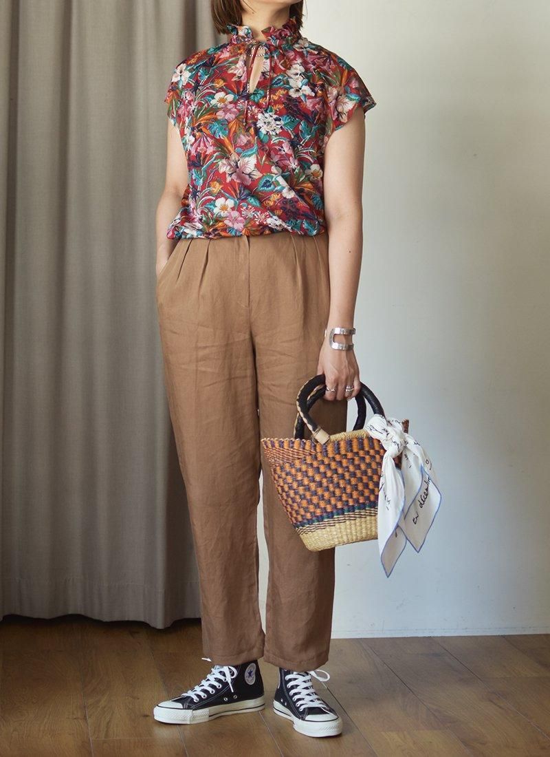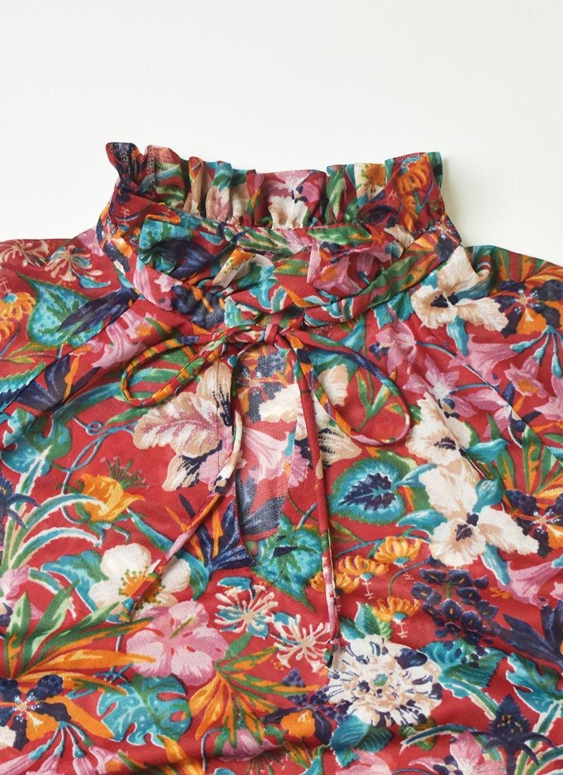 フリルネックが可愛い花柄ブラウス。