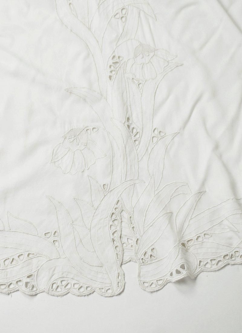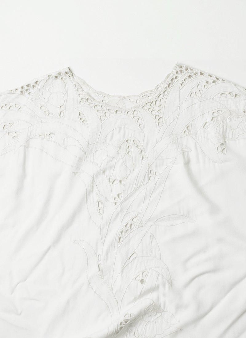 レースの様な刺繍の様なデザインが全体的に施されており、シンプルながらに目を惹く1着。