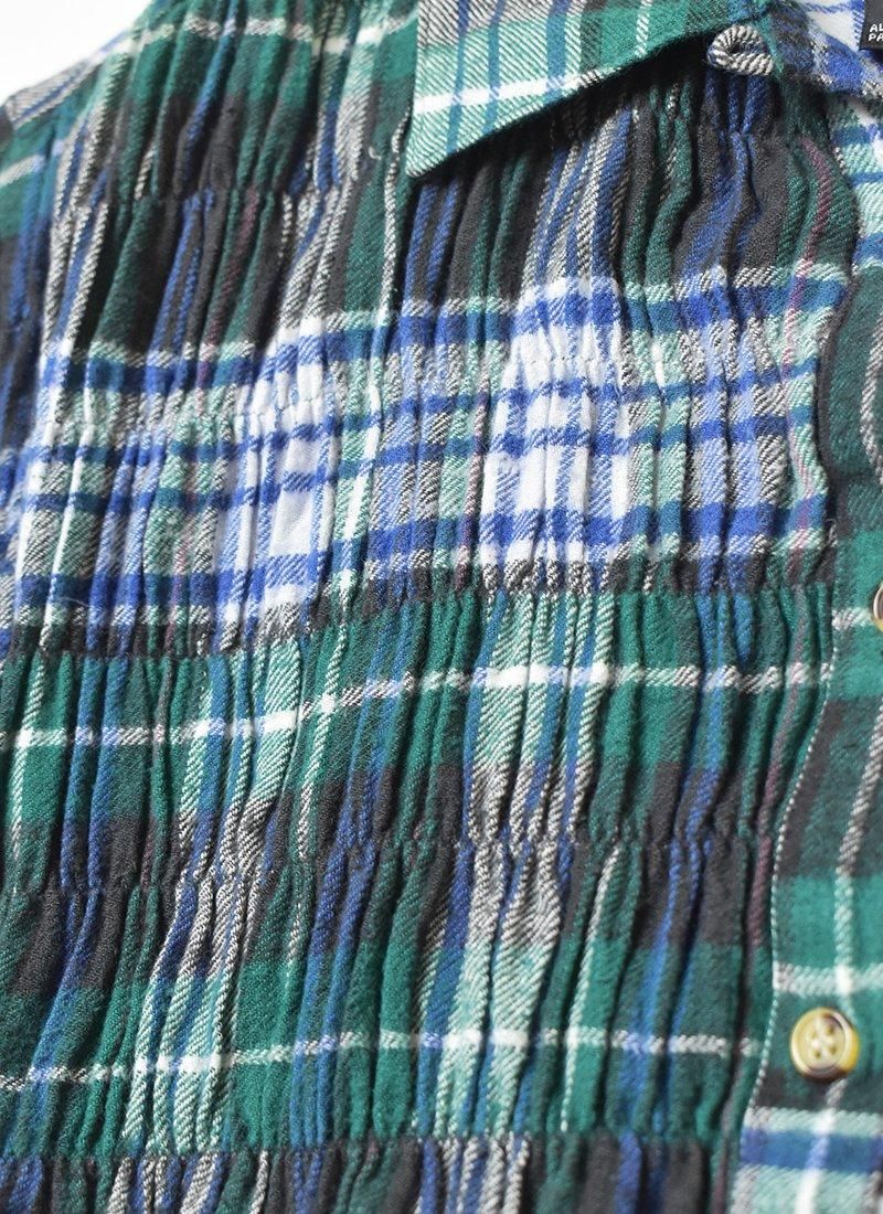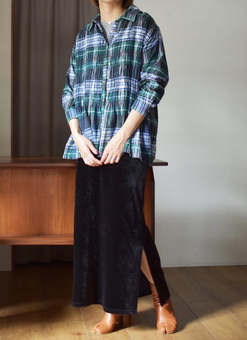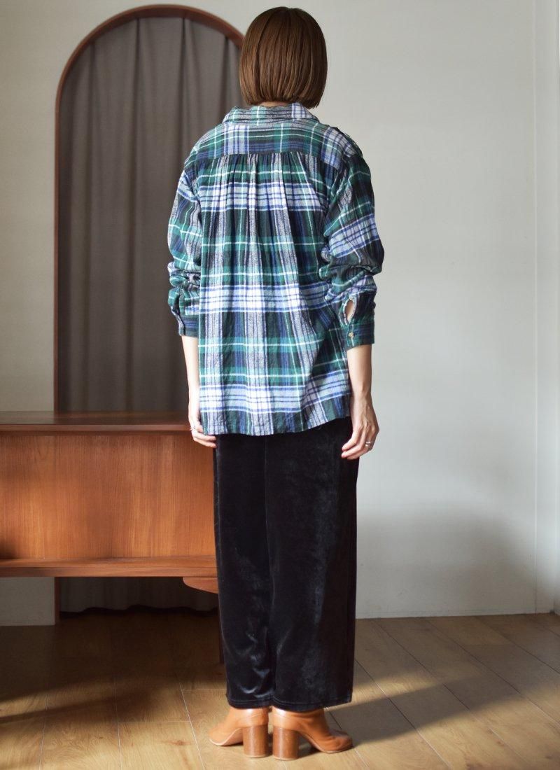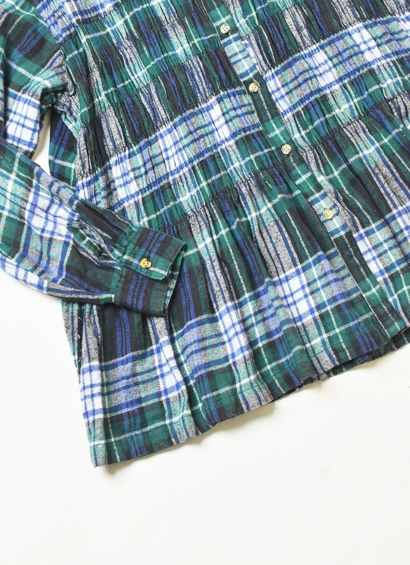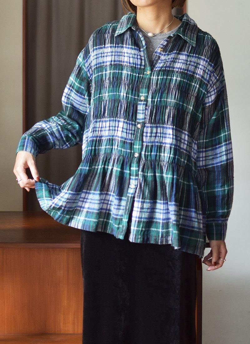 前後にたっぷりとギャザーが入ったチェックシャツ。