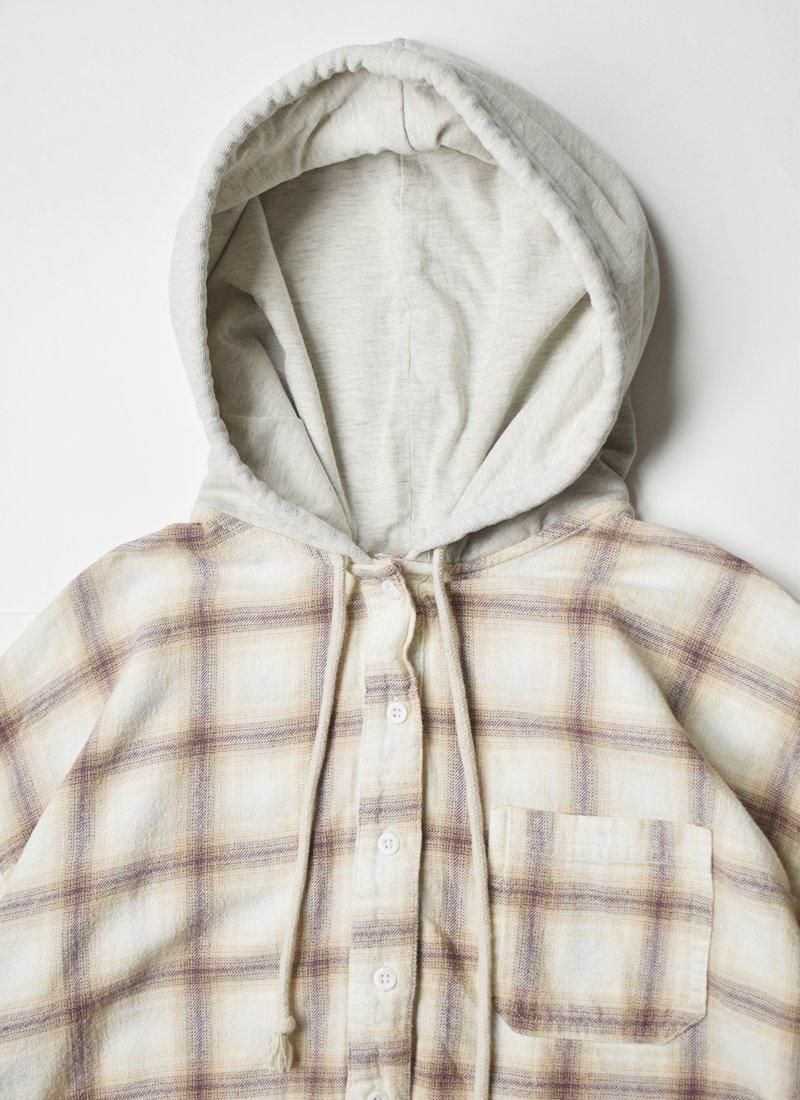 フードと一体化された普通じゃないところが魅力的なチェックシャツ。