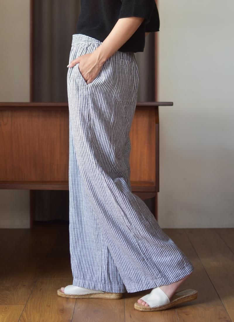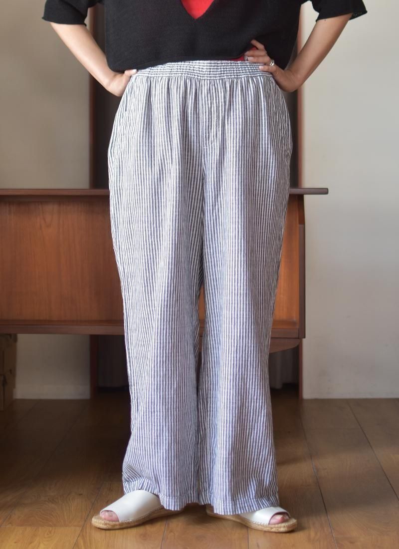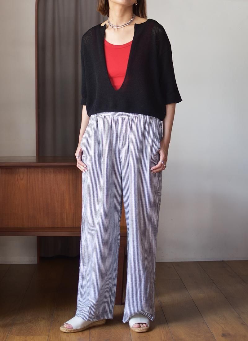 グレーベースのストライプがクールな印象のイージーワイドパンツ。