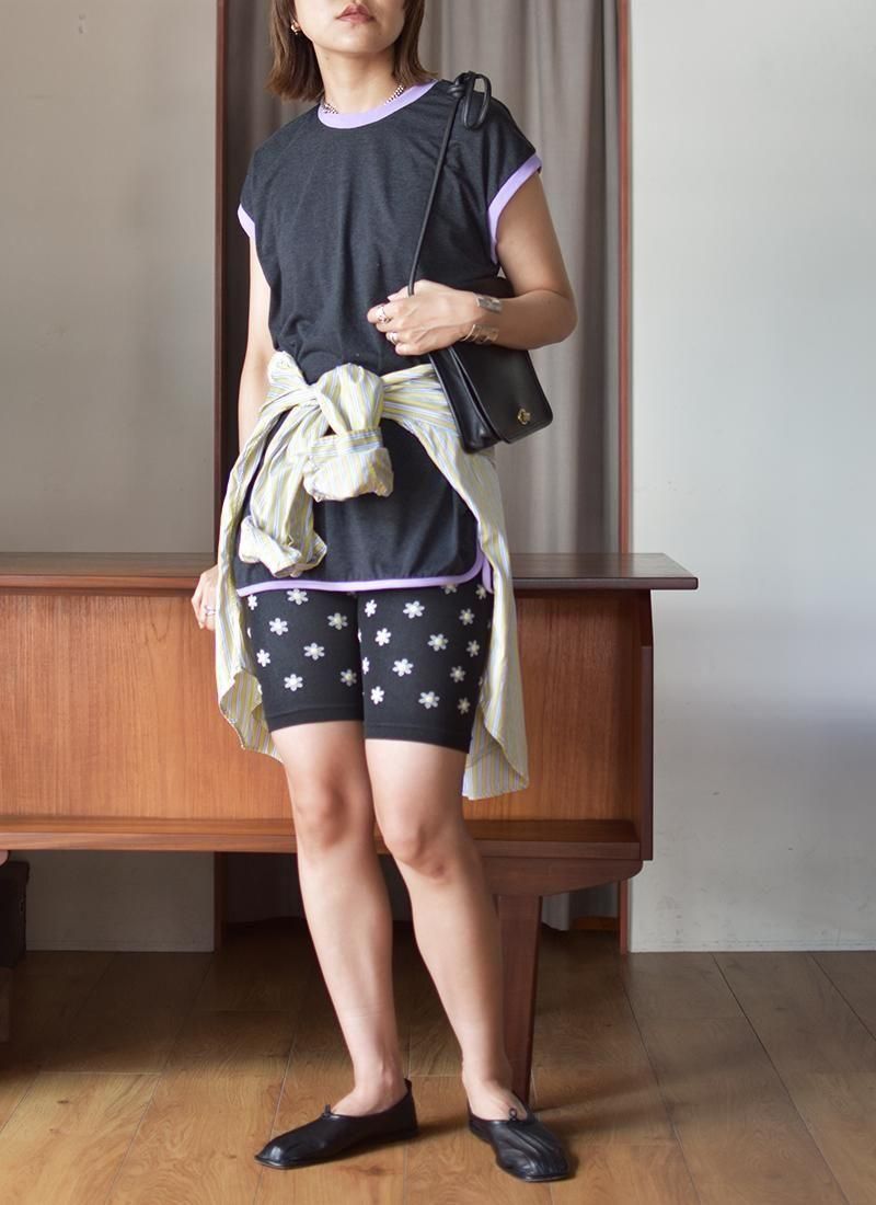 ヒップ周りが隠れるチュニック丈のシャツやジャケットと合わせたり、オーバーサイズのTシャツから裾の部分を覗かせるのがオススメです。