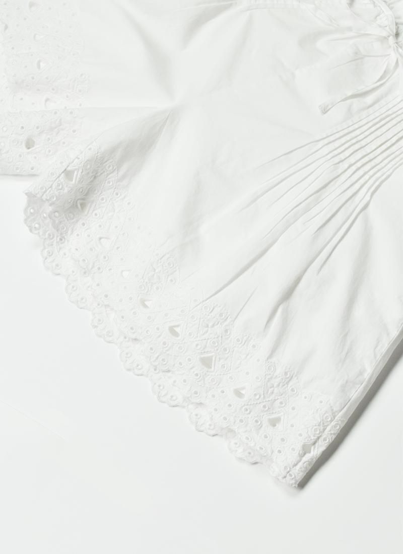 裾には幾何学模様のオリジナルスカラップ刺繍をあしらい、さりげない肌見せとともに、視線を引き寄せる華やかさをプラスしています。