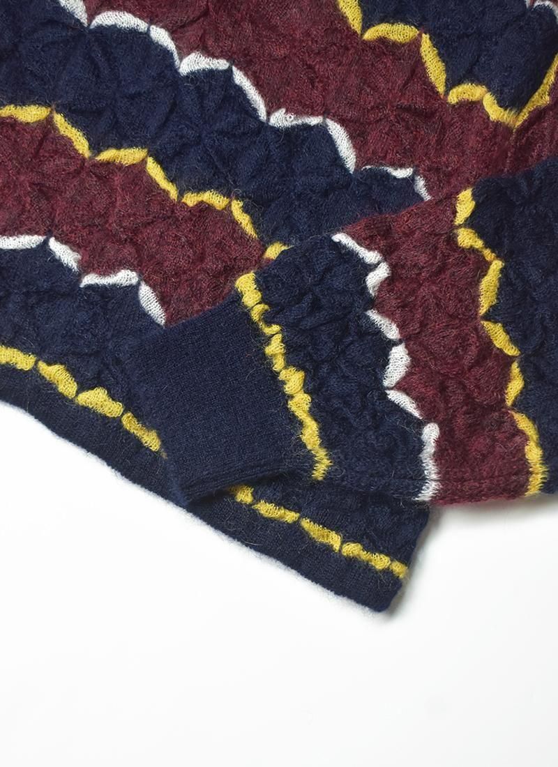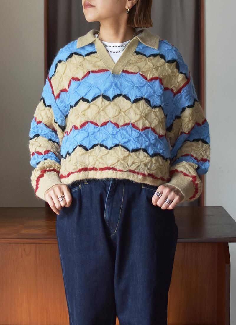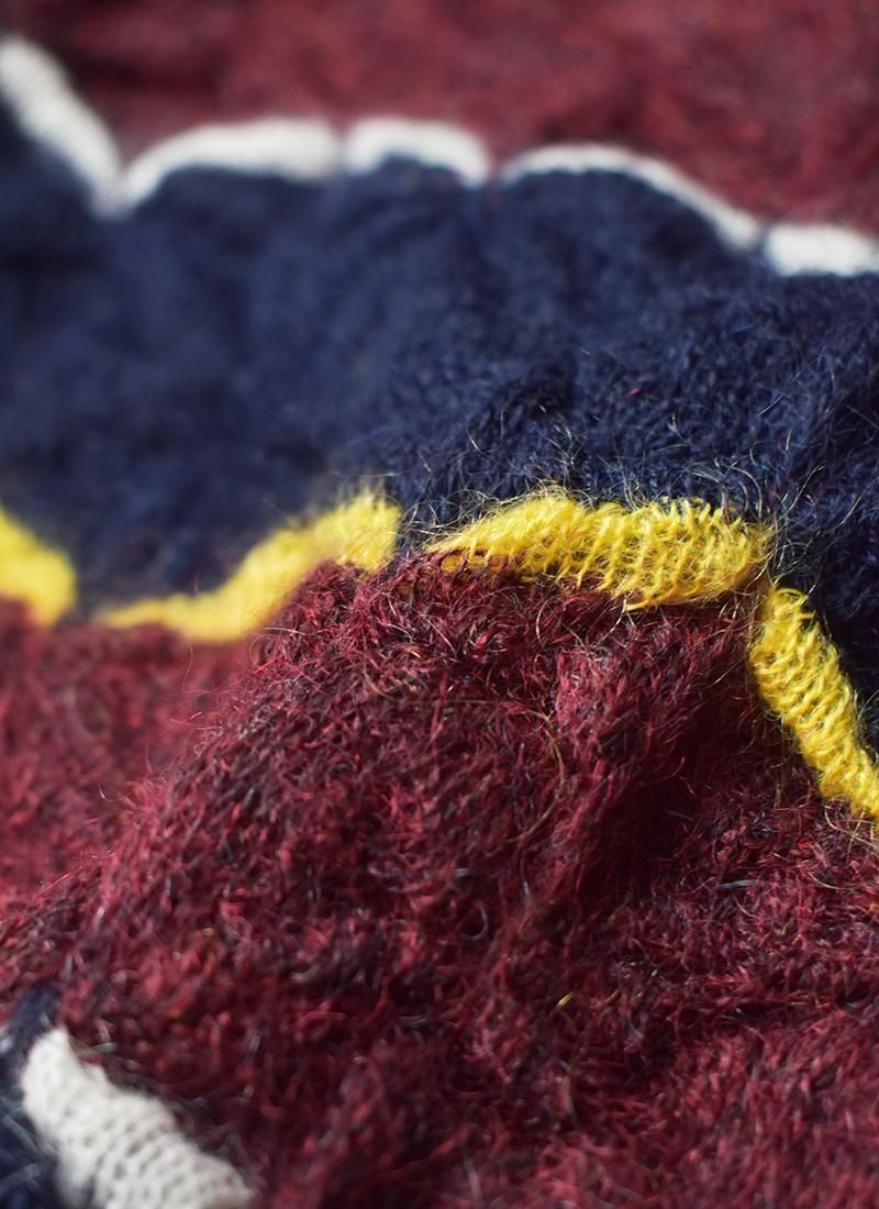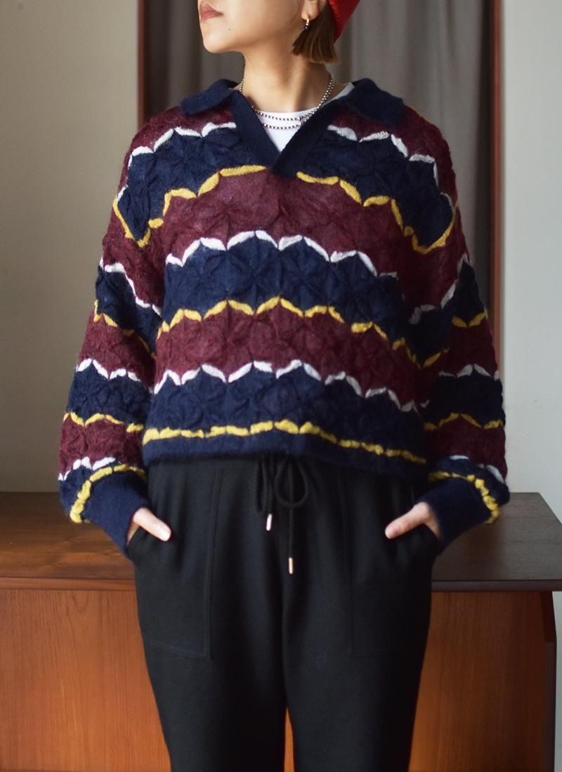 軽く・薄く仕上げたモヘアセーター。 折り紙や木工細工を彷彿とさせる幾何学的・立体的な編み方が特徴。 配色使いと衿元はラガーシャツを着想源に、アメカジと民藝を融合させたデザインです。