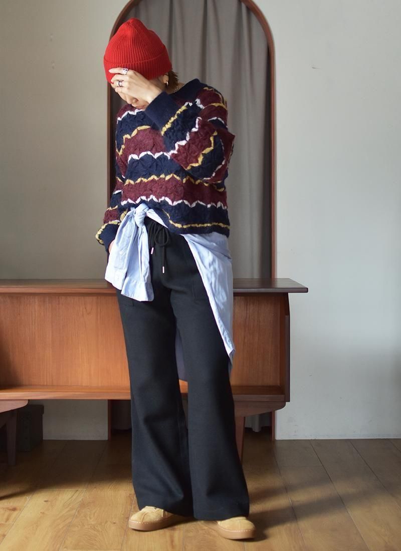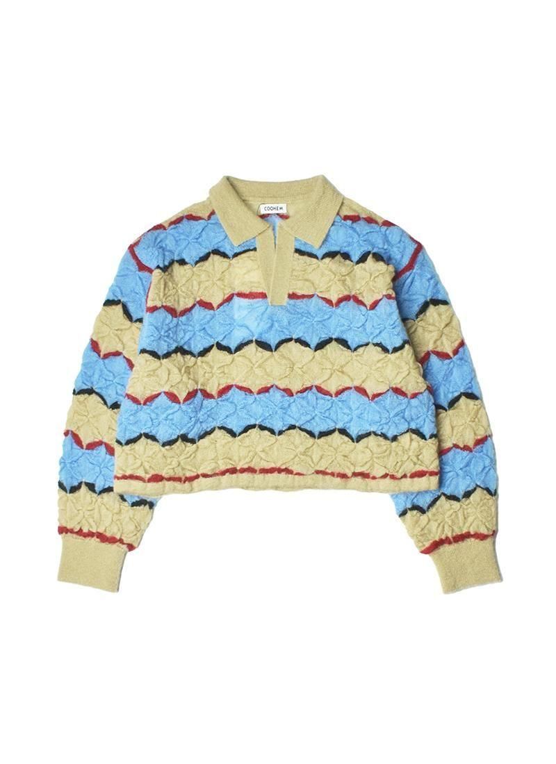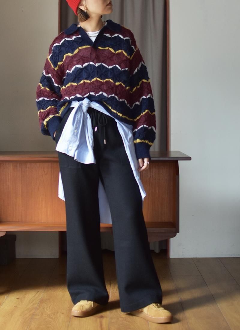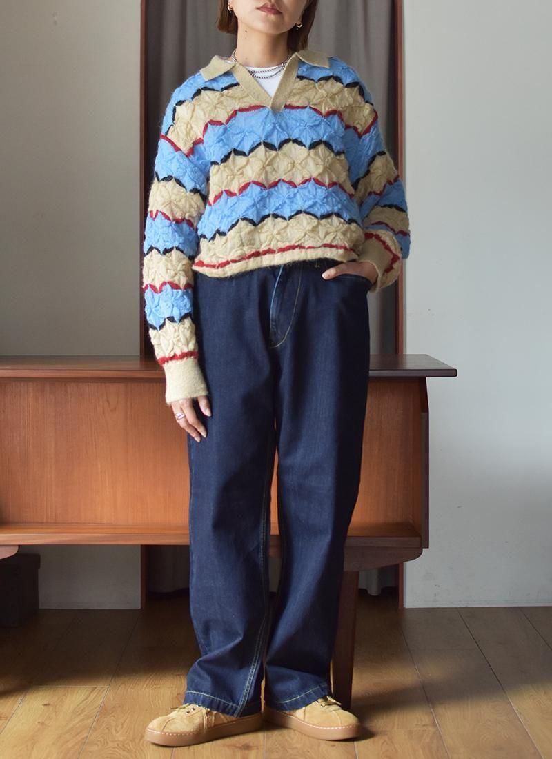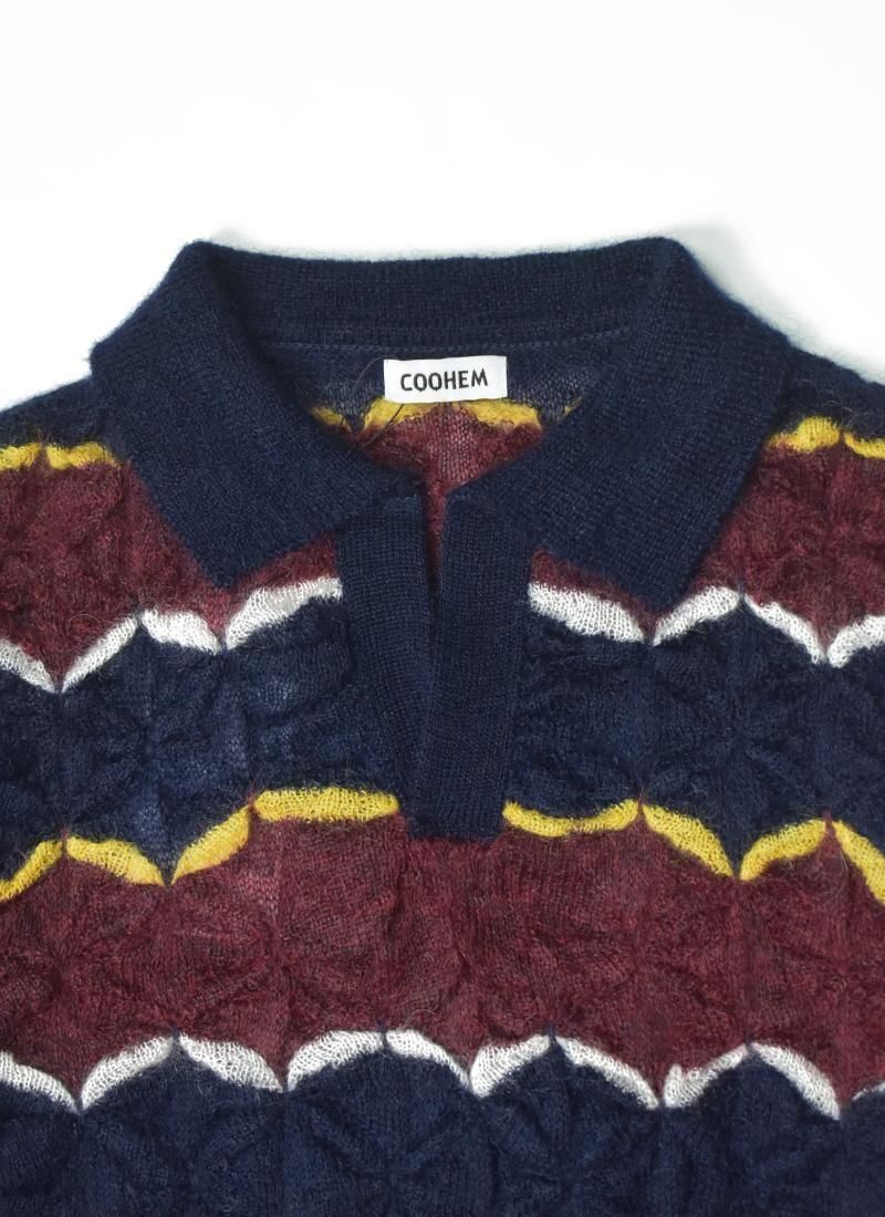 軽く・薄く仕上げたモヘアセーター。 折り紙や木工細工を彷彿とさせる幾何学的・立体的な編み方が特徴。 配色使いと衿元はラガーシャツを着想源に、アメカジと民藝を融合させたデザインです。