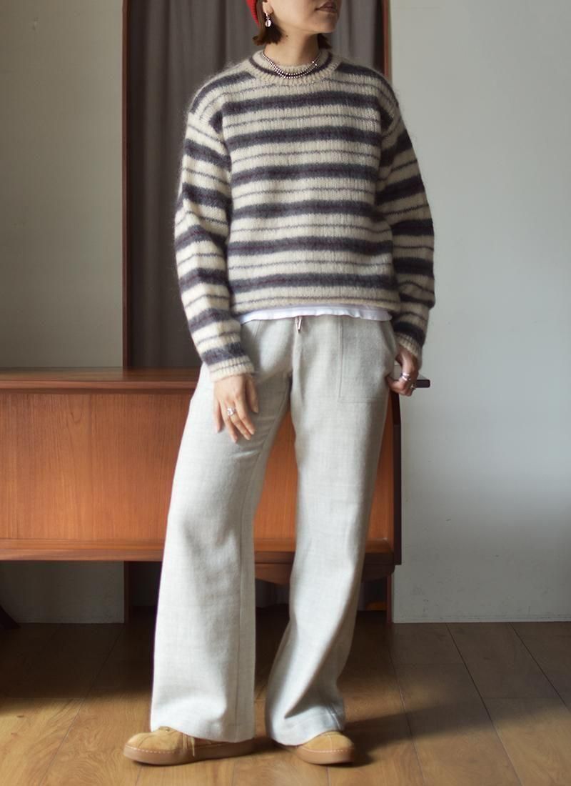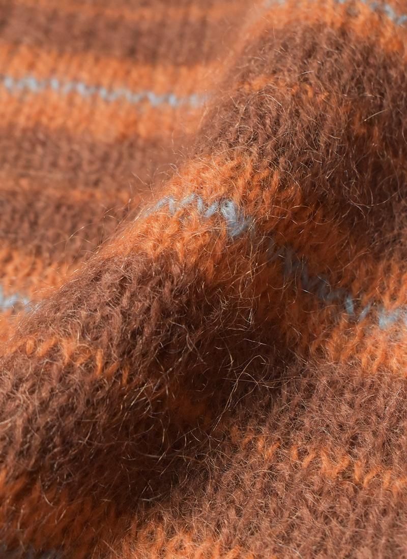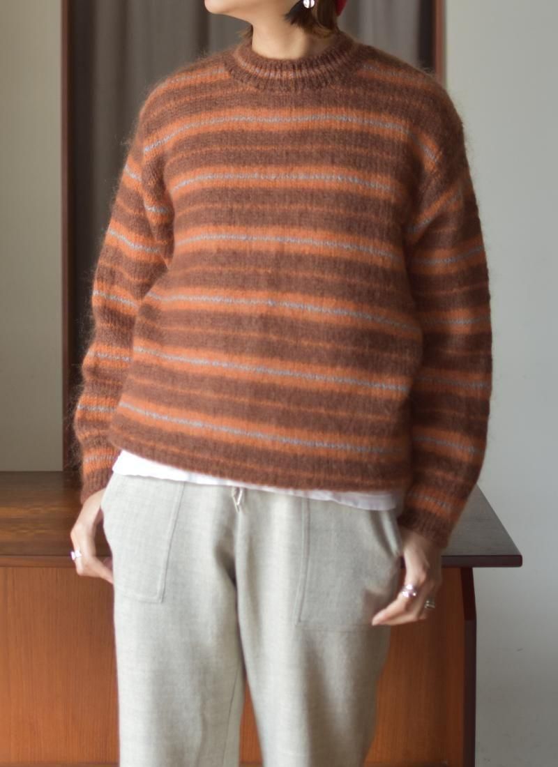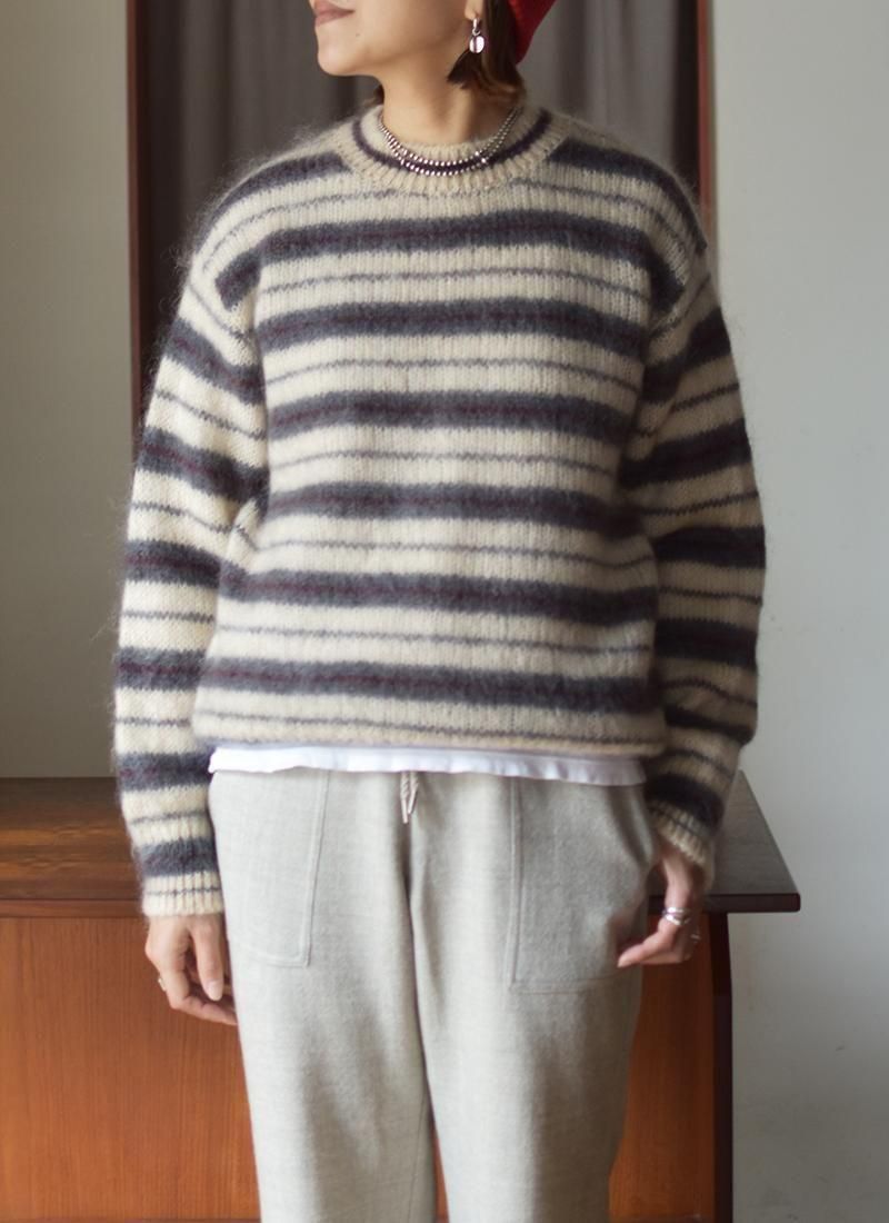 上質なモヘヤウール糸を使い、ざっくりとレトロなボーダー柄で編み上げたローゲージセーター。