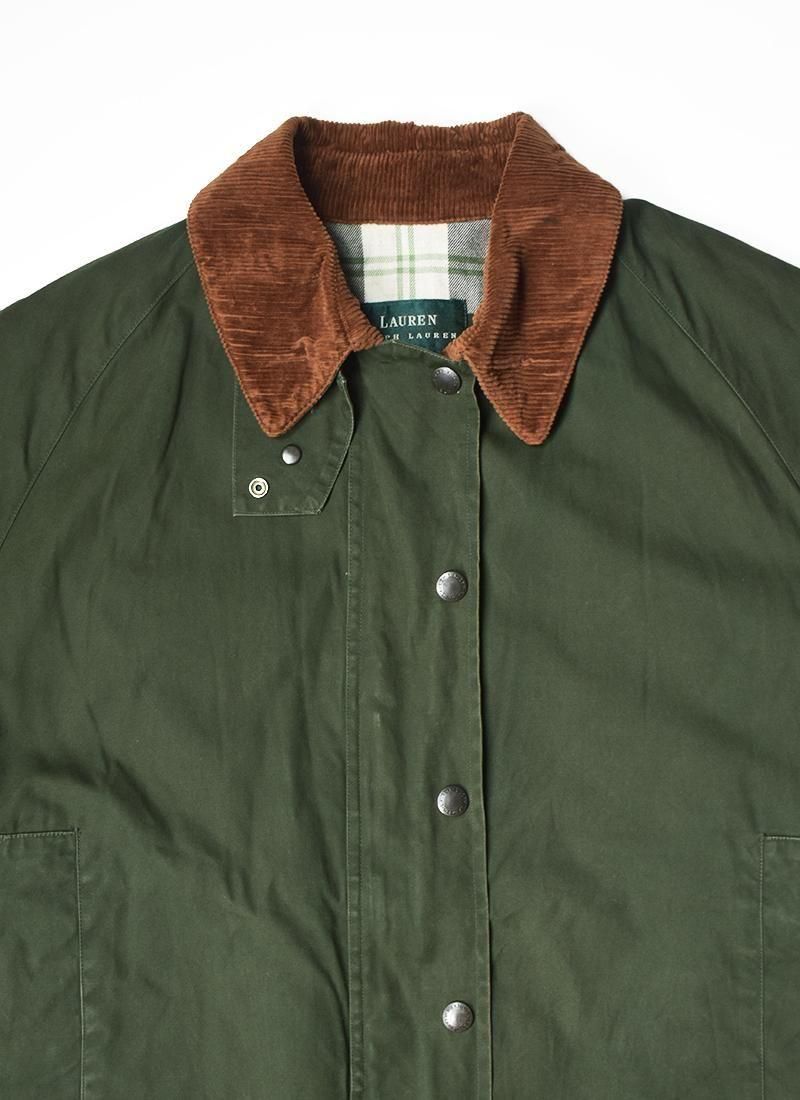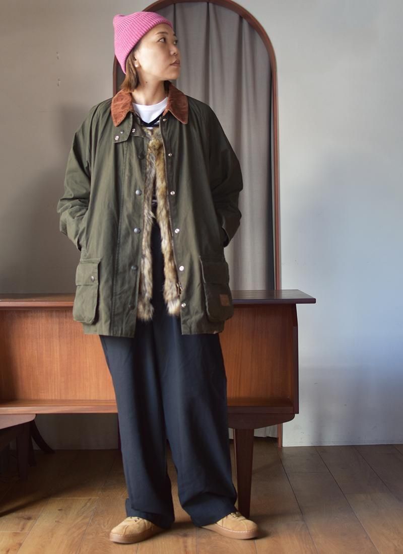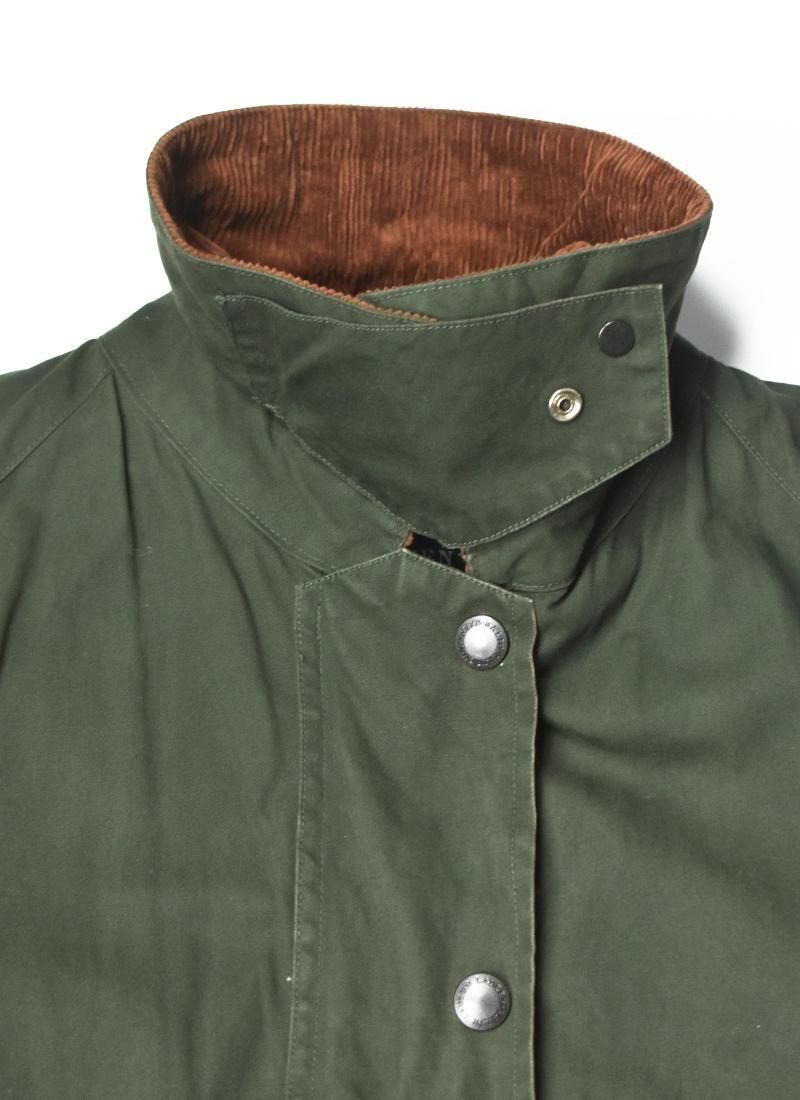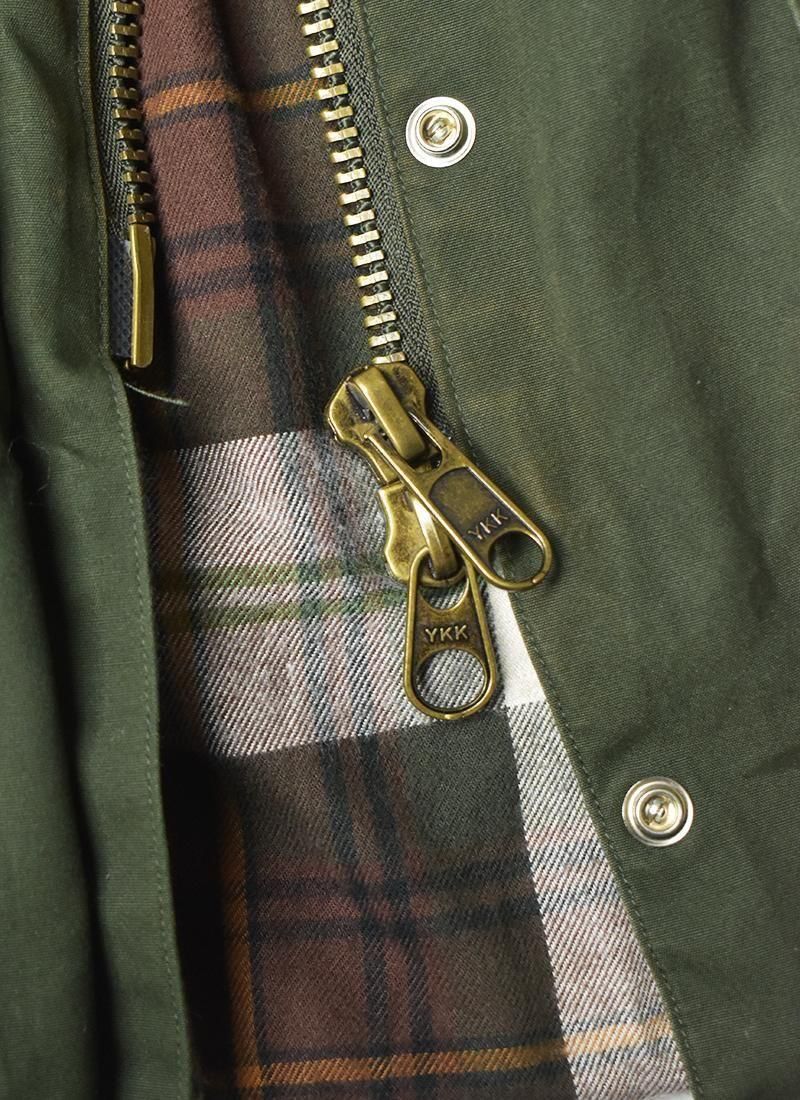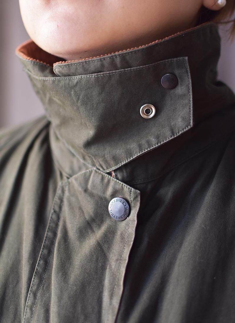 バブアーとは異なり、ワックスは入っていないコットン地なので女性に着やすい一枚です。